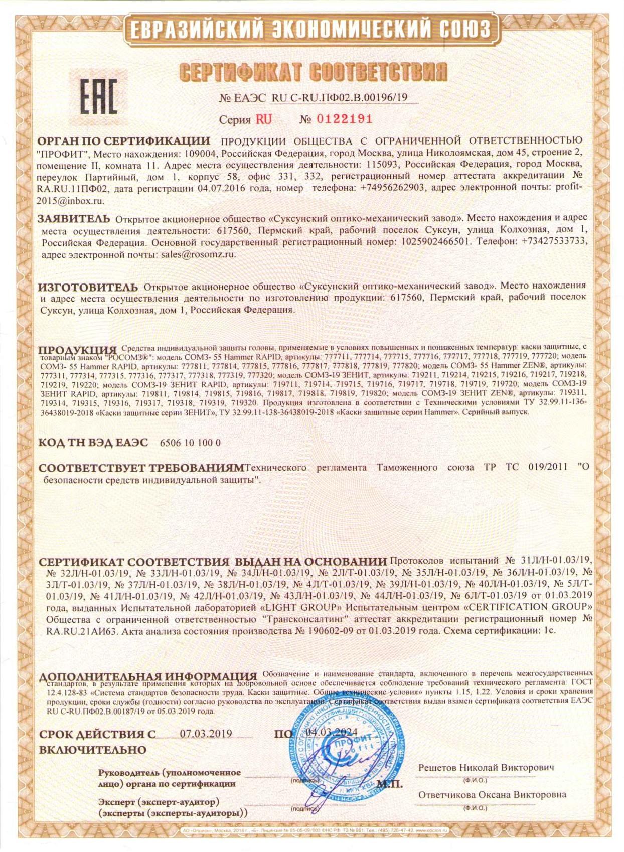 Сертификат на товар - Каска Росомз СОМЗ-19 Зенит Rapid желтая (артикул производителя 719815)