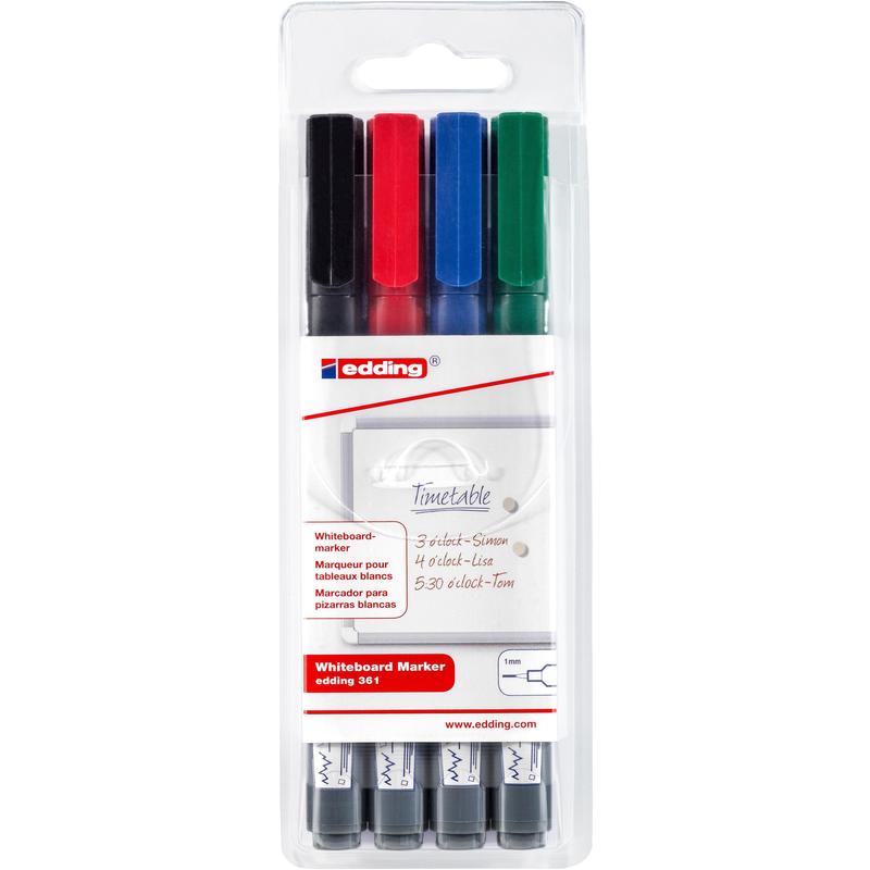 Набор маркеров для досок Edding 361 с технологией cap off. 4 цвета. Тонкая линия - 1 мм. Данные маркеры можно использовать на магнитно-маркерных досках, а также на флипчартах. Округлый наконечник. Пластиковый корпус. Стирается сухой губкой. Упаковка: ПВХ-конверт.