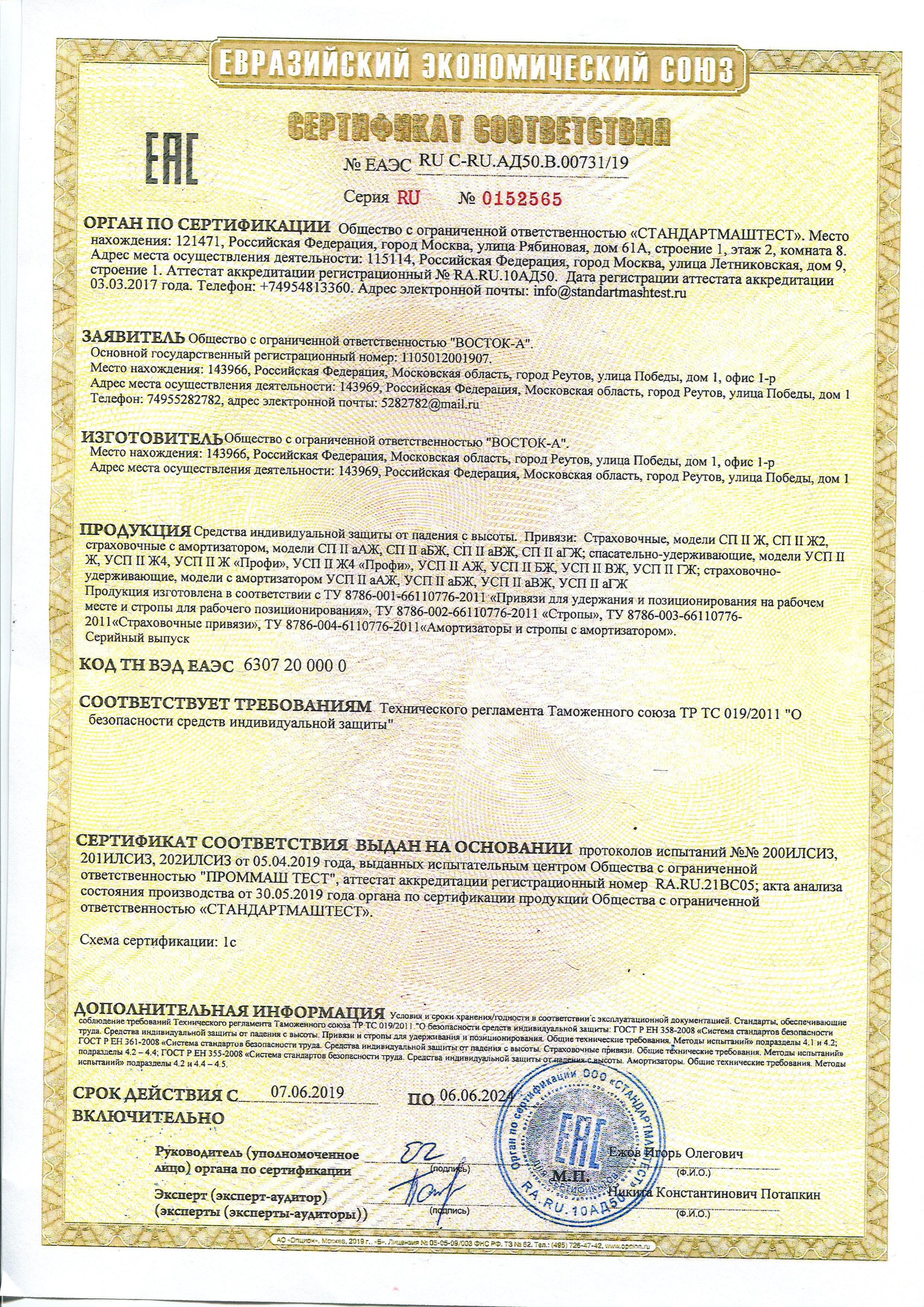 Сертификат на товар - Привязь удерживающая УСП 2 Ж4 Профи