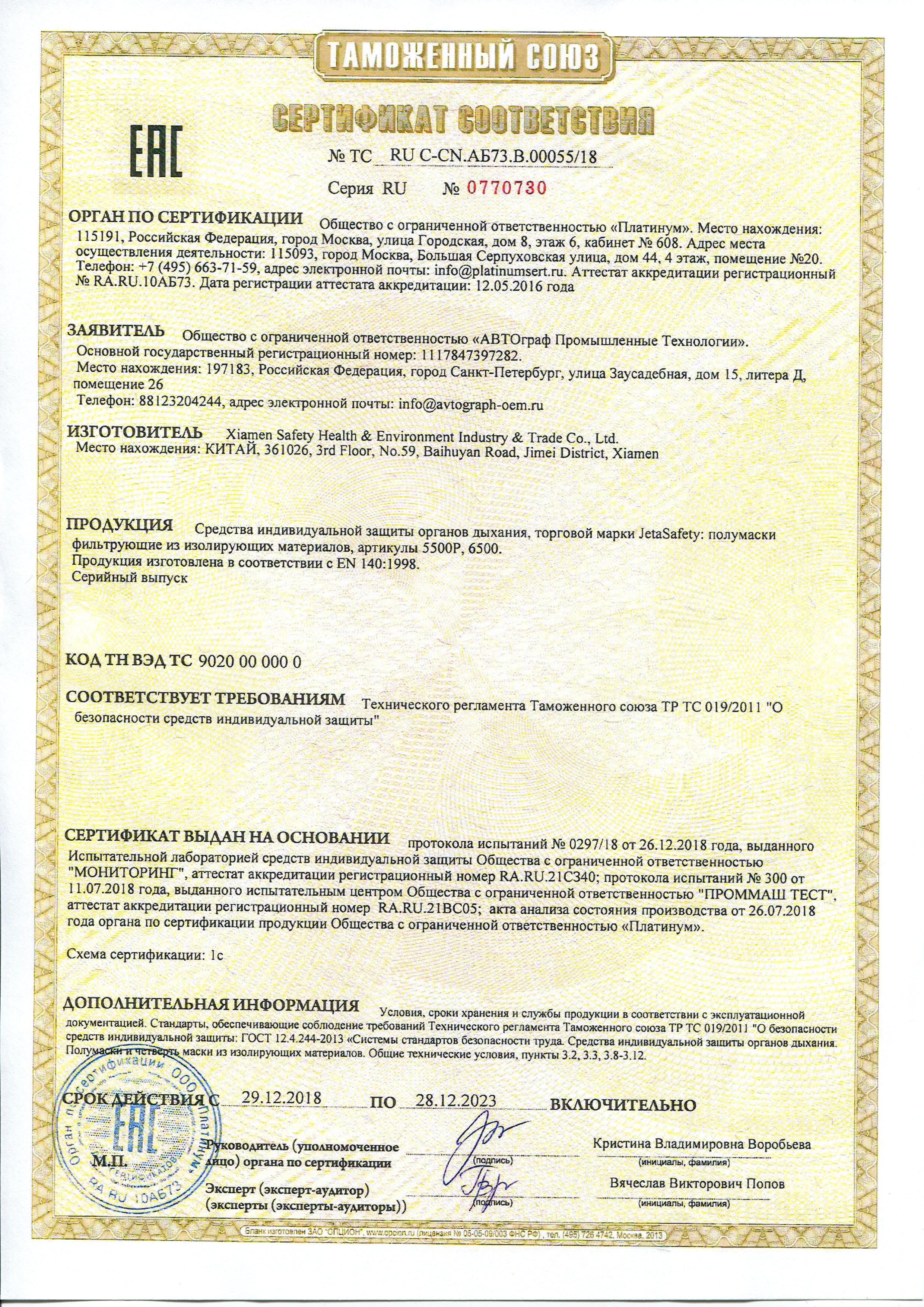 Сертификат на товар - Полумаска Jeta Safety 6500 размер L