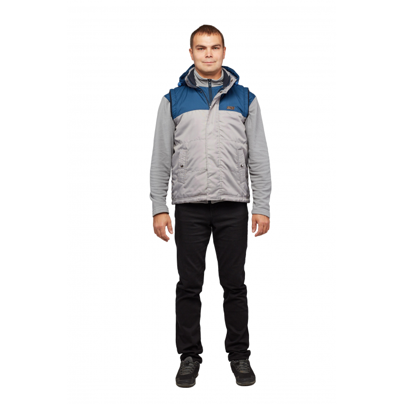 Жилет изготовлен из ткани дюспо, имеющей водоотталкивающую пропитку и обладающей ветрозащитными свойствами, плотностью 80г/кв.м, состав - 100% пэ. Утеплитель - синтепон, 200 г/кв.м. Основной цвет изделия серый, отделочный - синий. Жилет с центральной застежкой на молнию, с ветрозащитной планкой на кнопках, съемным капюшоном, подкладом. Капюшон регулируется при помощи шнура-резинки и фиксаторов. Жилет простеган, имеет два боковых накладных кармана на кнопках, один внутренний нагрудной прорезной карман на молнии. Внутренняя часть воротника и пройма рукавов обработана трикотажным полотном (подвяз).В коллекции Статус представлены утепленные жилеты Статус-ЖЛ и толстовки Статус-Т в двух цветовых вариантах: серый с красной отделкой и серый с синей отделкой. Толстовки и жилеты комбинируются между собой исходя из расцветки.