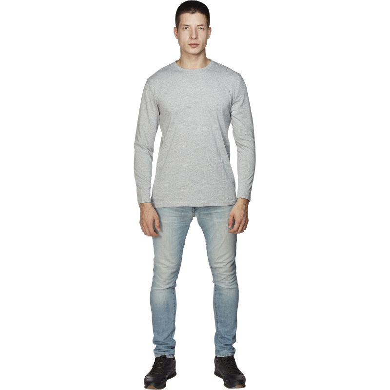 Футболка серого цвета с длинным руковом выполнена из специального материала - кулирная гладь, ткань из переплетенных нитей хлопка. Хлопок позволяет ткани дышать, приятно лежать на коже и не растягиваться. Футболка имеет стандартный крой, прямой. Плотный, круглый ворот и двойная отсрочка швов способствуют сохранению изначальной формы изделия. Сфера применения: для повседневного ношения, для занятий спортом.