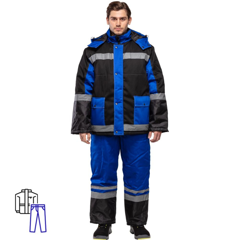 Рабочий зимний костюм з39-КБР состоит из куртки и полукомбинезона. Состав ткани костюма 65% - полиэстер, 35% - хлопок, плотностью 210 г. Материал подкладки - таффета, плотностью 60 г. Материал утеплителя костюма - синтепон, плотностью 200 г/кв.м (2 слоя в куртке, 1 слой в полукомбинезоне/брюках). Костюм можно использовать при работе на любом производстве или обслуживающем предприятии. ГОСТ 12.4.303-2016.Коллекция зимней рабочей одежды з39 представлена комплектами с курткой и брюками в черно-зеленой и черно-васильковой цветовой гамме.