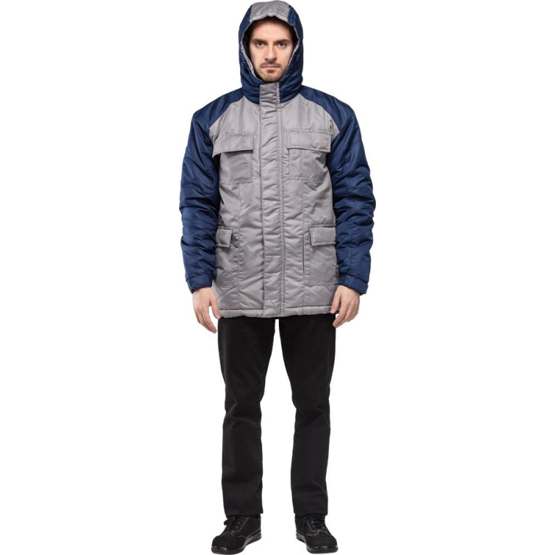Спецодежда зимняя куртка з41-КУ изготовлена из ткани 'Таслан', имеющей специальную защитную пропитку PU, которая придает ткани водонепроницаемые и ветрозащитные свойства, а так же покрытие ткани составом WR, который отталкивает влагу, позволяя ей скатываться по поверхности изделия. Сочетание пропитки PU и WR приводит к низкой водопропускающей способности ткани. Плотность ткани 135 г/кв.м, состав 100% пэ. Утеплитель - синтепон - 200 г/кв.м. Основной цвет изделия серый, отделочный - темно-синий.Куртка мужская утепленная, с капюшоном, с центральной застежкой на молнию, с ветрозащитной планкой. Куртка имеет четыре нагрудных кармана - два с клапаном на кнопках и два прорезных на молнии, четыре боковых кармана - два с клапаном на кнопках и два прорезных на молнии, и два внутренних кармана - один накладной на липучке и один прорезной на молнии. Капюшон несъемный, состоит из трех частей, с внутренней стороны капюшона понизу проходит планка из основной ткани. Капюшон регулируемый шнуром-резинкой и фиксаторами. Рукава трехшовные, втачные, с манжетой на резинке и патой на липучке. Полочки, спинка и притачные подборта выполнены из основной ткани. Кокетки, рукава и боковые части капюшона выполнены из отделочной ткани. По низу куртки проходит отделочная планка. Низ куртки регулируется при помощи шнура-резинки и фиксаторов. Рекомендуется ли использования в сельском хозяйстве. ГОСТ 25295-2003. Коллекция зимней рабочей одежды з41 представлена куртками з41-КУ в синем цвете с красной отделкой и серого цвета с синими элементами отделки.