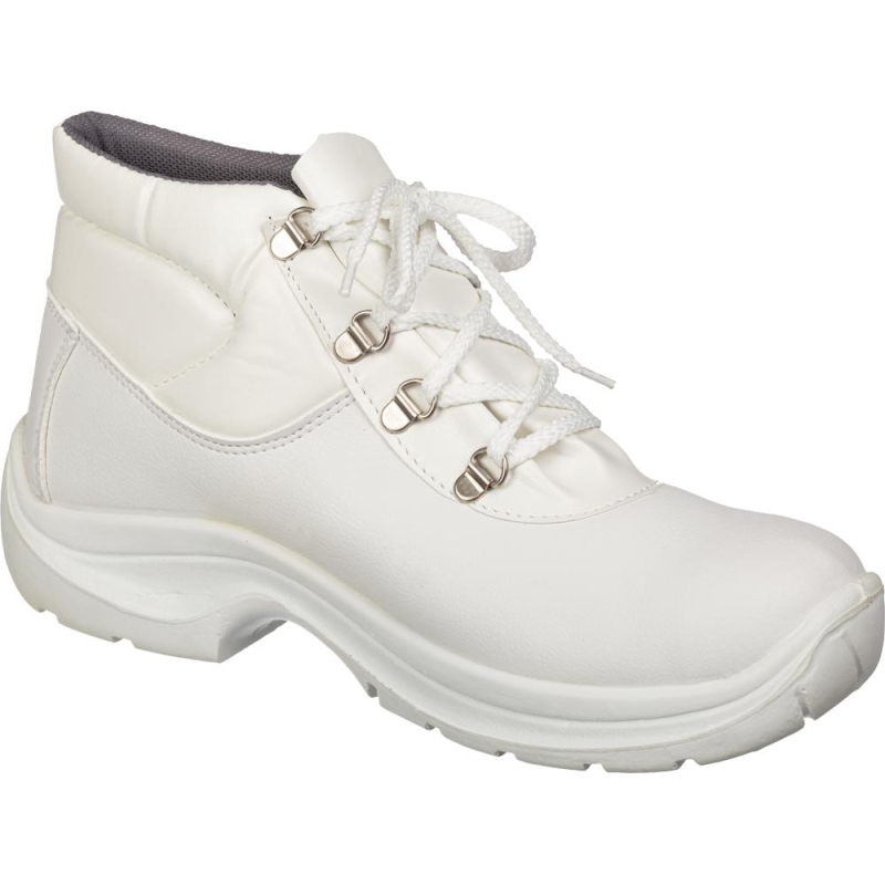 Ботинки белые на шнурках предназначены для работников пищевой, электронной, атомной, фармацевтической промышленности. Верх обуви синтетическая кожа - это устойчивая к загрязнениям и атмосферным воздействиям, высокотехнологичная микро волокнистая, композиционная кожа, повышенной толщины. Она состоит из мельчайших волокон обеспечивающих доступ воздуха. Не требует ухода. Пригодна для стирки в промышленных стиральных машинах. Подкладка - воздухопроницаемое подкладочное полотно Cambrelle. Мягкий кант и перфорация на союзке обеспечивают комфорт при носке обуви. Удобная колодка и низкий вес позволяют носить обувь весь день, не испытывая усталости. Маслобензостойкая, антистатическая, износоустойчивая подошва из полиуретана. Термопластичный подносок.При длительном воздействии пониженных температур от -20 °C материал, из которого изготовлена обувь, теряет свои свойства и становится хрупким.