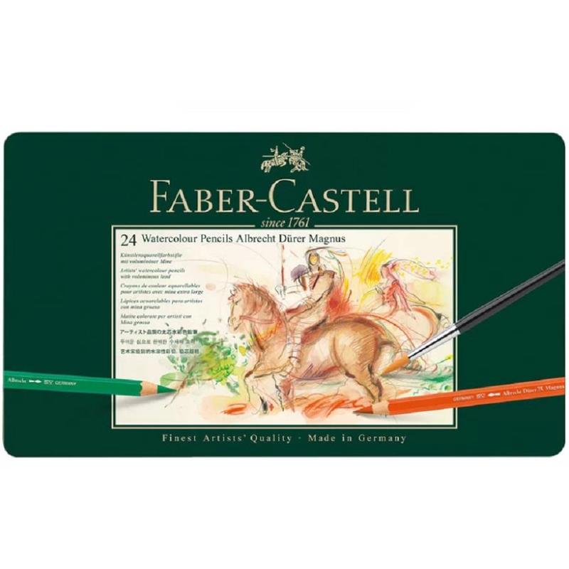 "Отличительной особенностью этих акварельных карандашей является утолщенный мягкий и насыщенный пигментом грифель, который легко размывается водой, не оставляя на бумаге ""комков"" и карандашных царапин. Мягкий грифель позволяет легко наносить цвет на бумагу широкоми мазками, накладывать оттенки друг на друга и экспериментировать со слоями. Карандаши обладают максимальной светостойкостью. Для работы с этими карандашами необходима плотная или специальная акварельная бумага. В зависимости от типа бумаги возможно получение необычных визуальных эффектов. Акварельные карандаши отлично подходят для смешанных техник. Распространенной техникой является доработка акварельного рисунка цветными карандашами Polychromos. Толщина грифеля 5.3 мм. В наборе 24 акварельных карандаша и 1 кисточка. Поставляются в металлической коробке. Сделано в Германии."