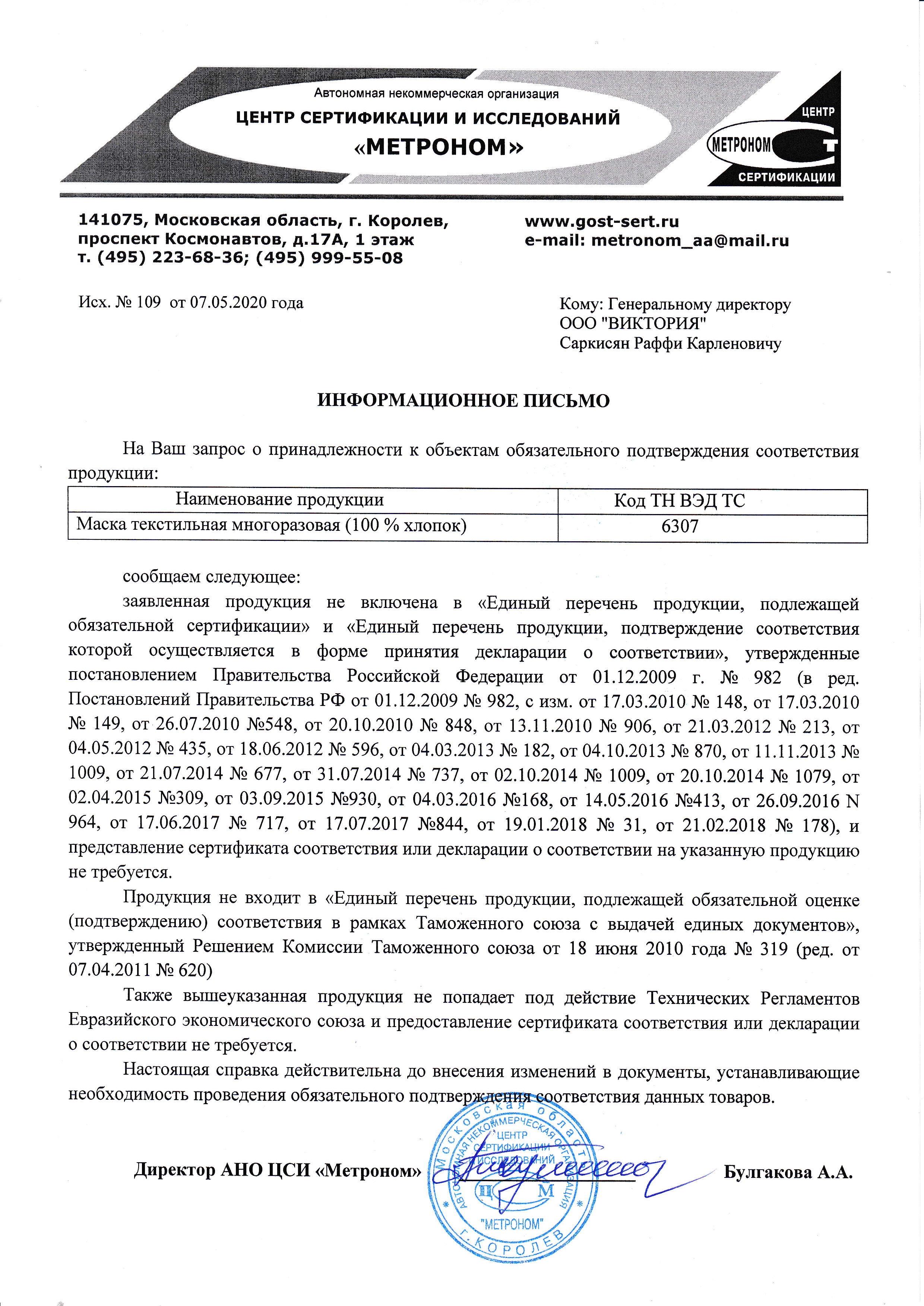 Сертификат на товар - Маска защитная многоразовая текстильная черная (10 штук в упаковке)