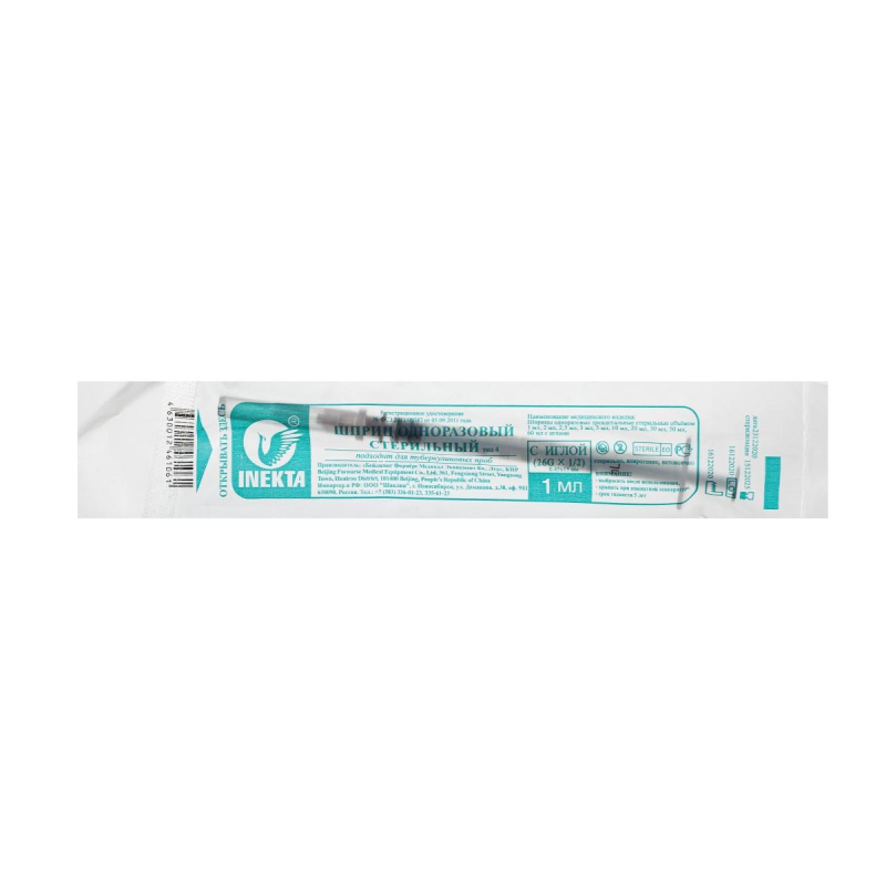 Шприц туберкулиновый Inekta 1 мл 26G (0.45x13 мм, 100 штук в упаковке). Предназначен для лекарственных инъекций. Игла надета на шприц, имеет трехгранную лазерную заточку, размер 2G (0.45. x 13 мм). Стерилизация гамма-лучами. Индивидуальная упаковка шприца - полибэг, устойчива к повышенной влажности окружающей среды, легко вскрывается. Упаковка имеет цветовую маркировку согласно ISO, что облегчает медперсоналу быстрый выбор нужного объёма шприца и иглы. Срок годности 5 лет.