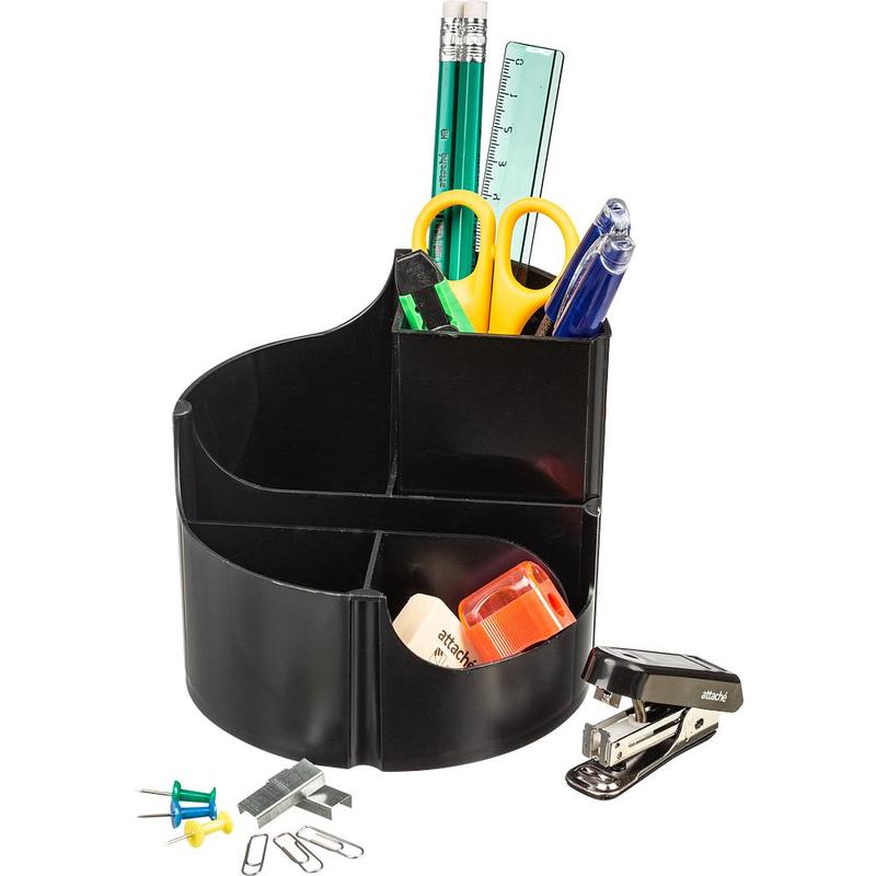 Настольный набор Attache Economy Оптима выполнен из пластика черного цвета. Подставка-трансформер, в зависимости от расположения лотка, количество отделений составляет 5 или 6. Включает 14 предметов: две шариковые ручки, два карандаша с ластиком, нож канцелярский, точилка, ластик, ножницы, линейка, степлер, скобы, скрепки, кнопки и подставку. Поставляется в термоусадочной пленке. Размеры изделия: 110x120 мм.