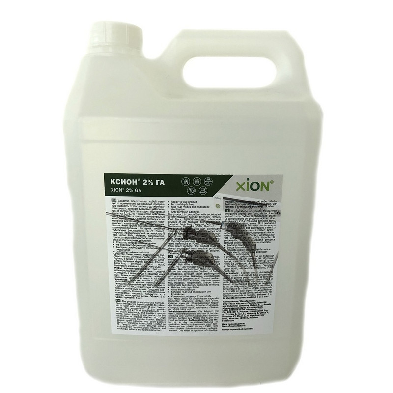 Дезсредство Xion GA предназначено для дезинфекции изделий медицинского назначения (ИМН); дезинфекции высокого уровня (ДВУ) эндоскопов (жестких и гибких), ручным и механизированным способом; стерилизации изделий медицинского назначения (ИМН) из различных материалов, включая хирургические, стоматологические инструменты (в т.ч. вращающиеся) и материалы, жесткие и гибкие эндоскопы и инструменты к ним. Состав: глутаровый альдегид 2,2-2,7% - в качестве действующего вещества, а также вспомогательные компоненты, вода. Объем: 5 л.