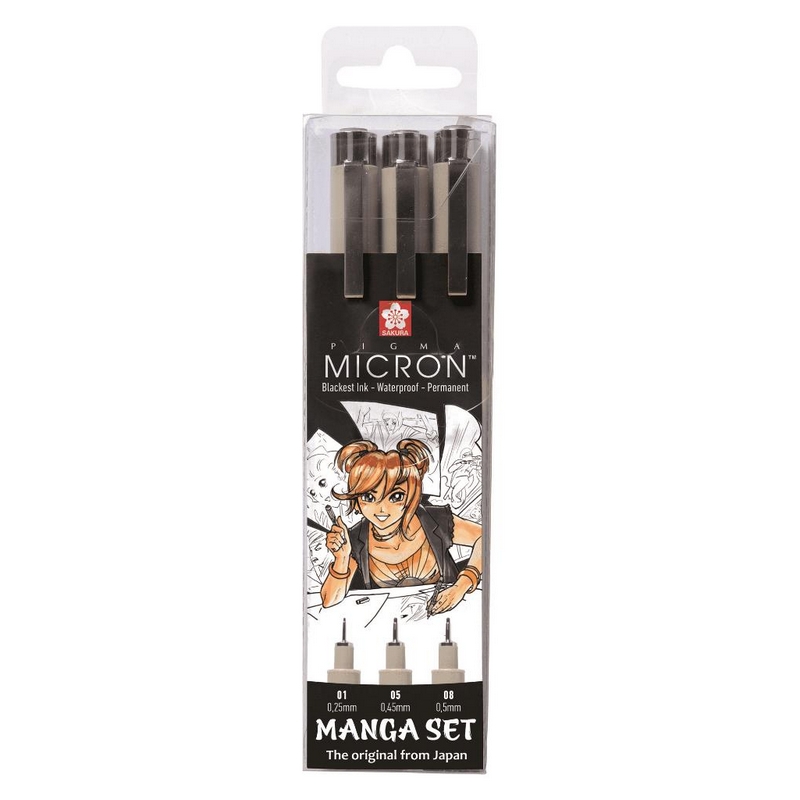 В наборе 3 черных капиллярных ручки Sakura Pigma micron: 01 (толщина пишущего узла 0,25 мм), 05 (толщина пишущего узла 0,45 мм), 08 (толщина пишущего узла 0,5 мм). В ручках серии Pigma используются архивные чернила Pigma Ink: светостойкие (не выцветают), химически стабильные, на водной основе и пигментах. После высыхания устойчивы к воздействию воды (не расплываются при попадании воды на бумагу), не пачкаются, не смазываются и не проступают на оборотную сторону листа (для большинства видов бумаги) Применение Sakura Pigma Micron в творчестве: - смешанные техники: используют совместно с акварелью, акрилом, карандашами и прочими художественными материалами; - скетчинг; - иллюстрация и мультипликация; - комиксы и манга; - различные виды хобби: скрапбукинг, создание авторских открыток, пригласительных и штампов (Rubber Stamping), роспись кукол, квилтинг и другие; - медитативная техника рисования Zentangle; - декоративная роспись по ткани (предпочтительно хлопок, ткань с рисунком не рекомендуется стирать); - ежедневное письмо: ведение ежедневников, дневников, журналов, запись лекций; - подпись официальных документов; - черчение; - технический рисунок.
