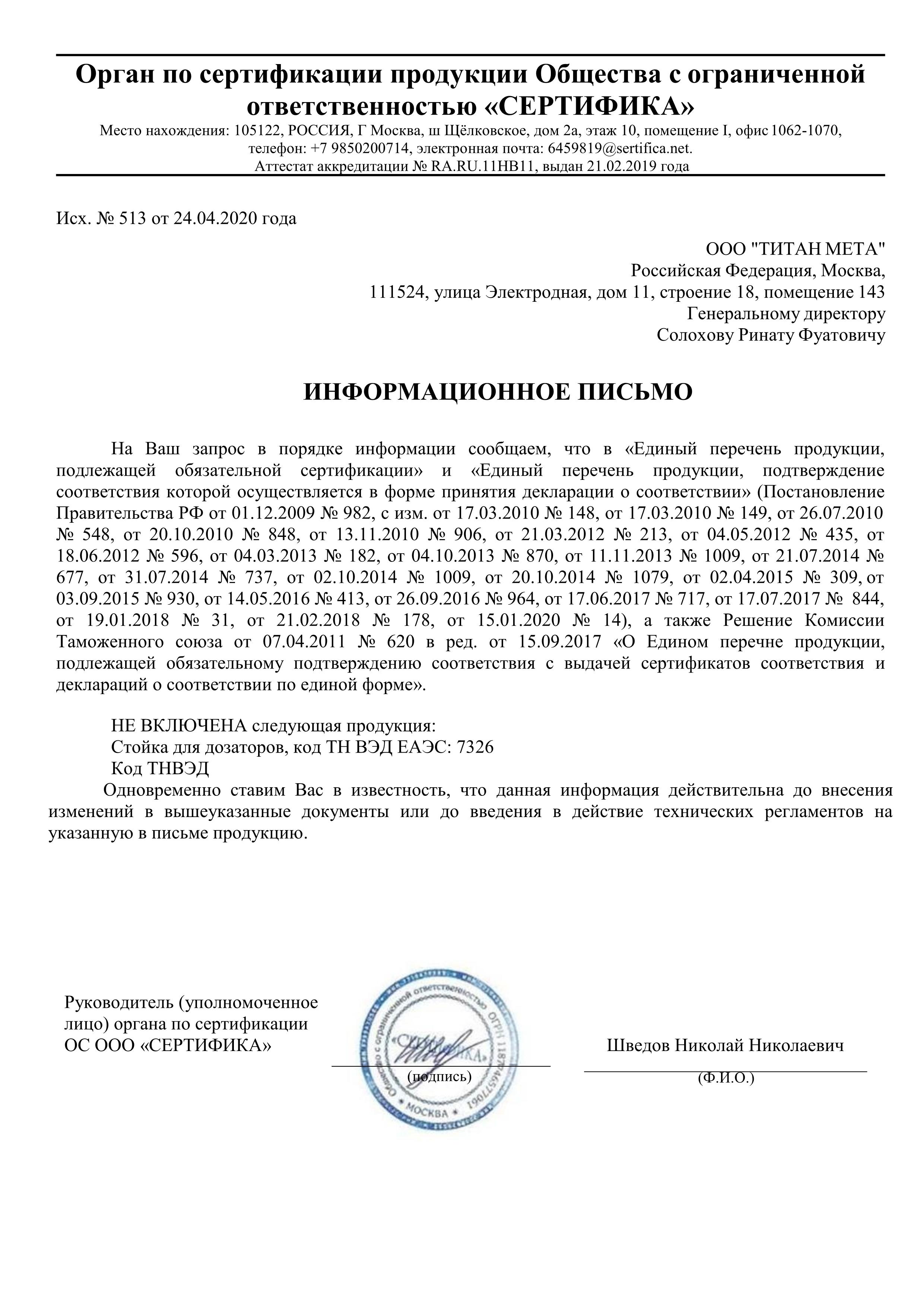 Сертификат на товар - Стойка напольная для дозатора черная СД-1К