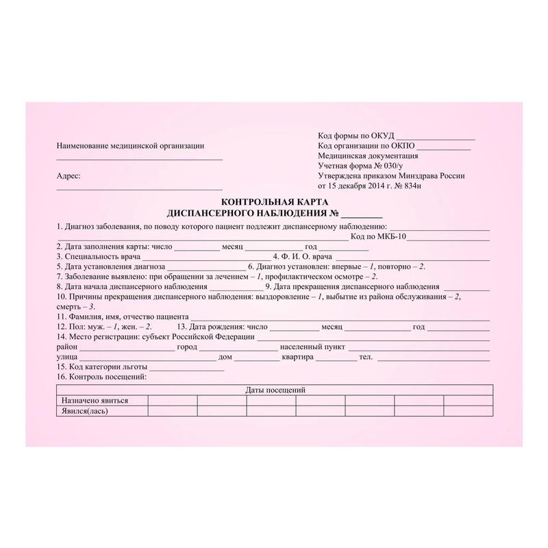 Бланк Контрольная карта диспансерного наблюдения форма 030/у КЖ 651/1 офсет А5 (148х210 мм, 100 листов)