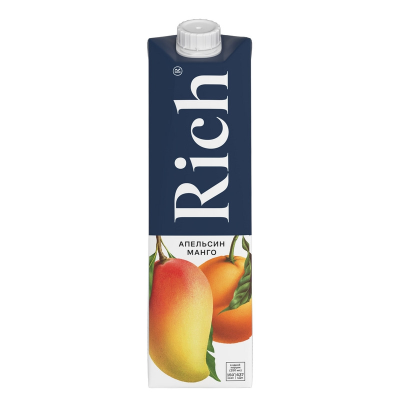 Сок Rich апельсин-манго 1 л. Состав: апельсиновый сок, пюре из манго, сахар, регулятор кислотности - лимонная кислота, вода. Изготовлен из концентрированного сока и пюре. Пищевая ценность 100 г: белки - 0 г, жиры - 0 г, углеводы - 13 г. Энергетическая ценность 100 г: 60 ккал. Условия хранения: температура от 0 до 25°С.