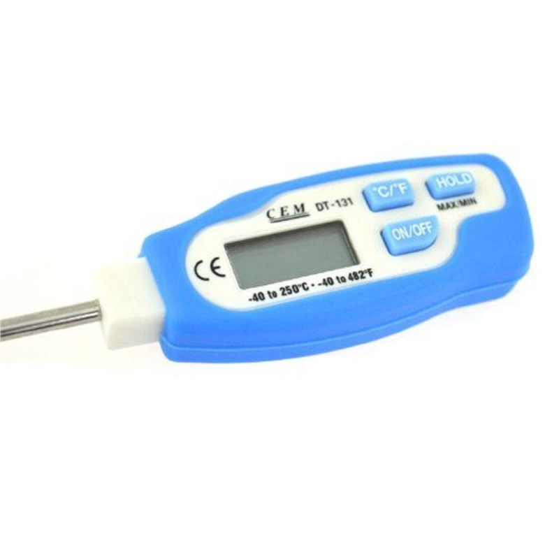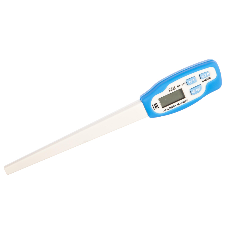 Влагозащищенный цифровой термометр модели DT-131 Термометры DT-131 предназначены для измерения температуры с помощью контактного щупа. ПОРЯДОК РАБОТЫ Для работы с термометром необходимо снять защитный чехол, нажать кнопку 'ON/OFF' (Вкл. /Выкл.) и поместить щуп (не менее, чем наполовину своей длины) в измеряемую среду. На экране отображается текущее значение температуры среды измерения. Для увеличения реального срока службы батареи термометр автоматически выключается примерно через 20 минут. Переключение между единицами измерения температуры °C to °F Единицу измерения температуры можно изменить с °C на °F нажатием кнопки °C / °F.По правилам, по умолчанию ставится только отметка в паспорте инструмента о поверке. Вся поверка регистрируется на специальном сайте 'РСТ Метрология'. Для проверки достаточно ввести серийный номер изделия в поиск и последовательно пройти по ссылкам: Метрология - Модуль 'Проверки' - Результаты проверок, и найти свой прибор в списке совпадений. Для получения сертификата на бумажном носителе, нужно предварительное уведомление при оформлении заказа на товар с поверкой. Срок выпуска сертификата 2-5 рабочих дней после регистрации результатов поверки.