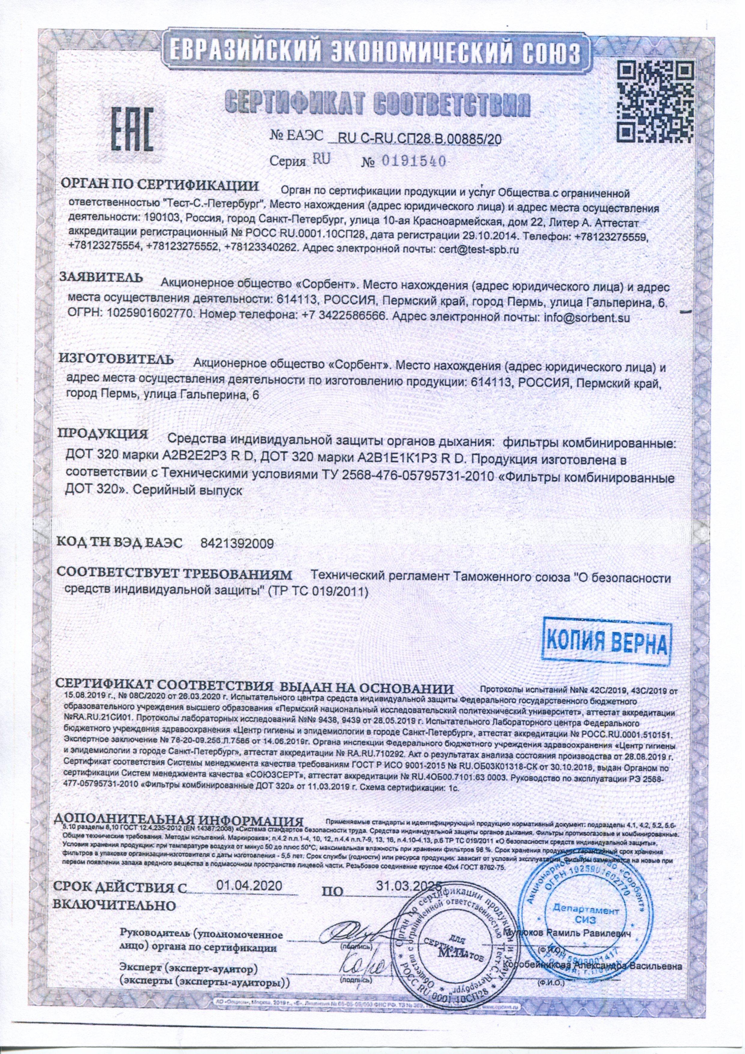 Сертификат на товар - Патрон противогазовый Дот 320 марки А2В1Е1К1Р3RD