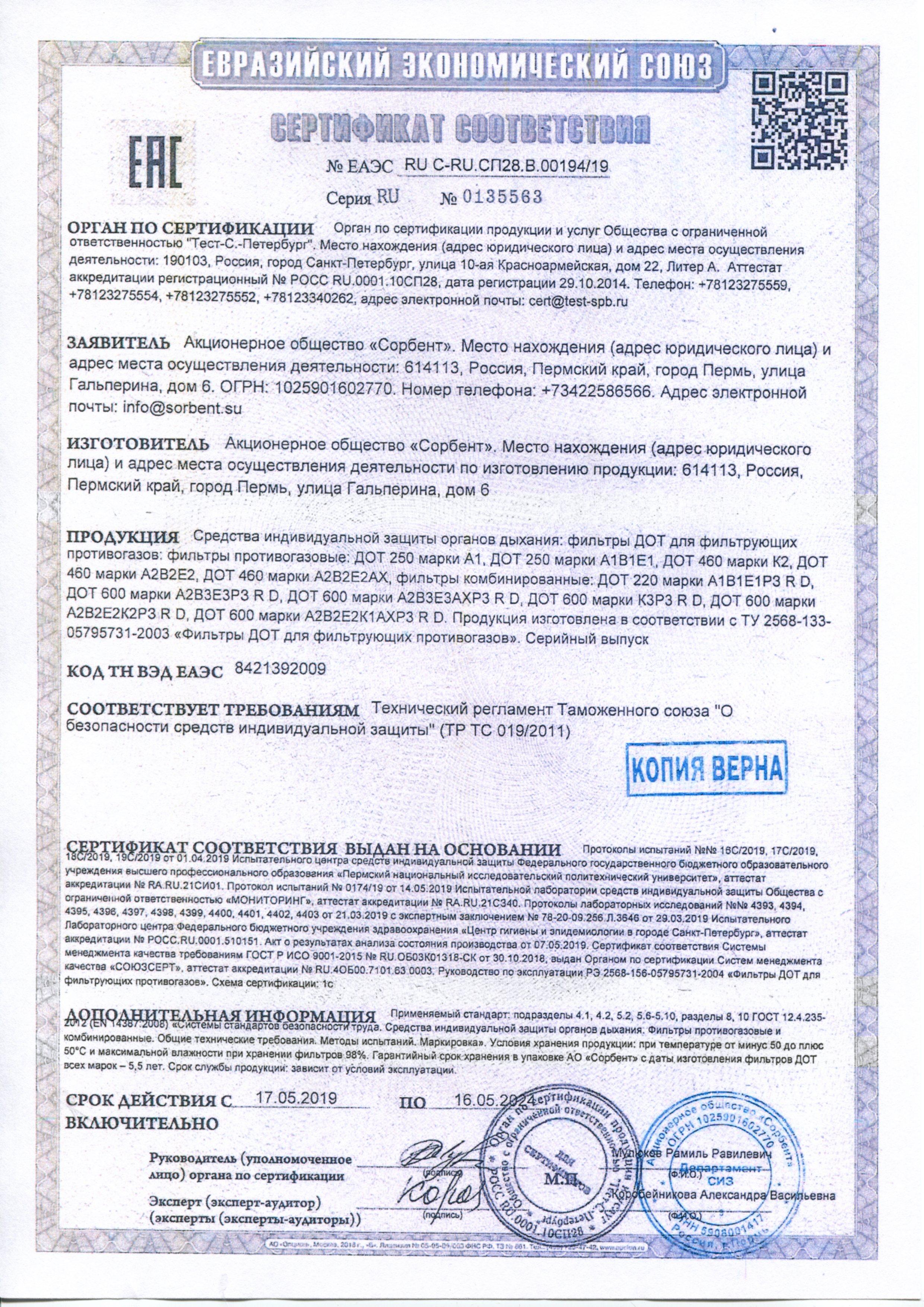 Сертификат на товар - Патрон противогазовый Дот 250 марки А1