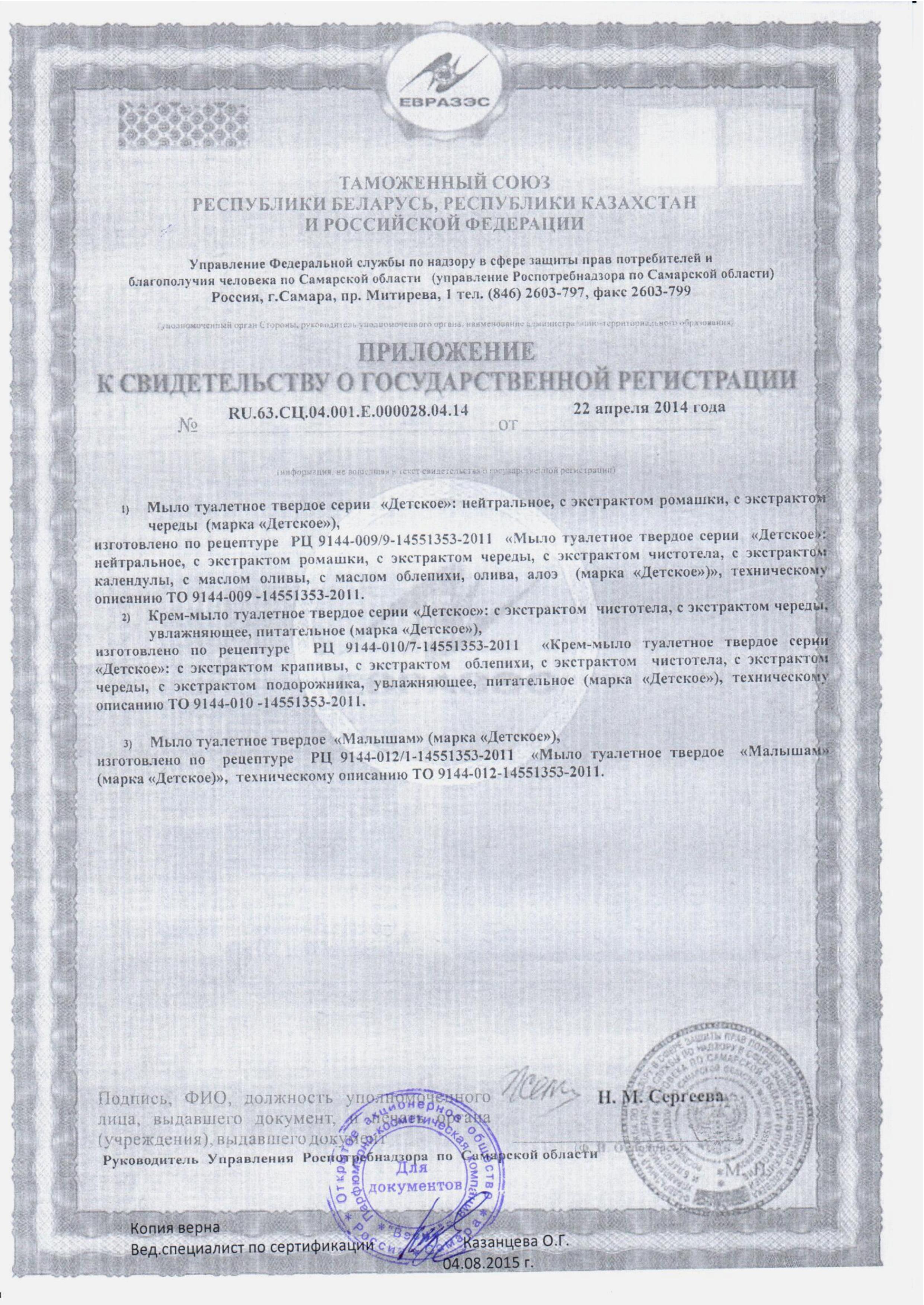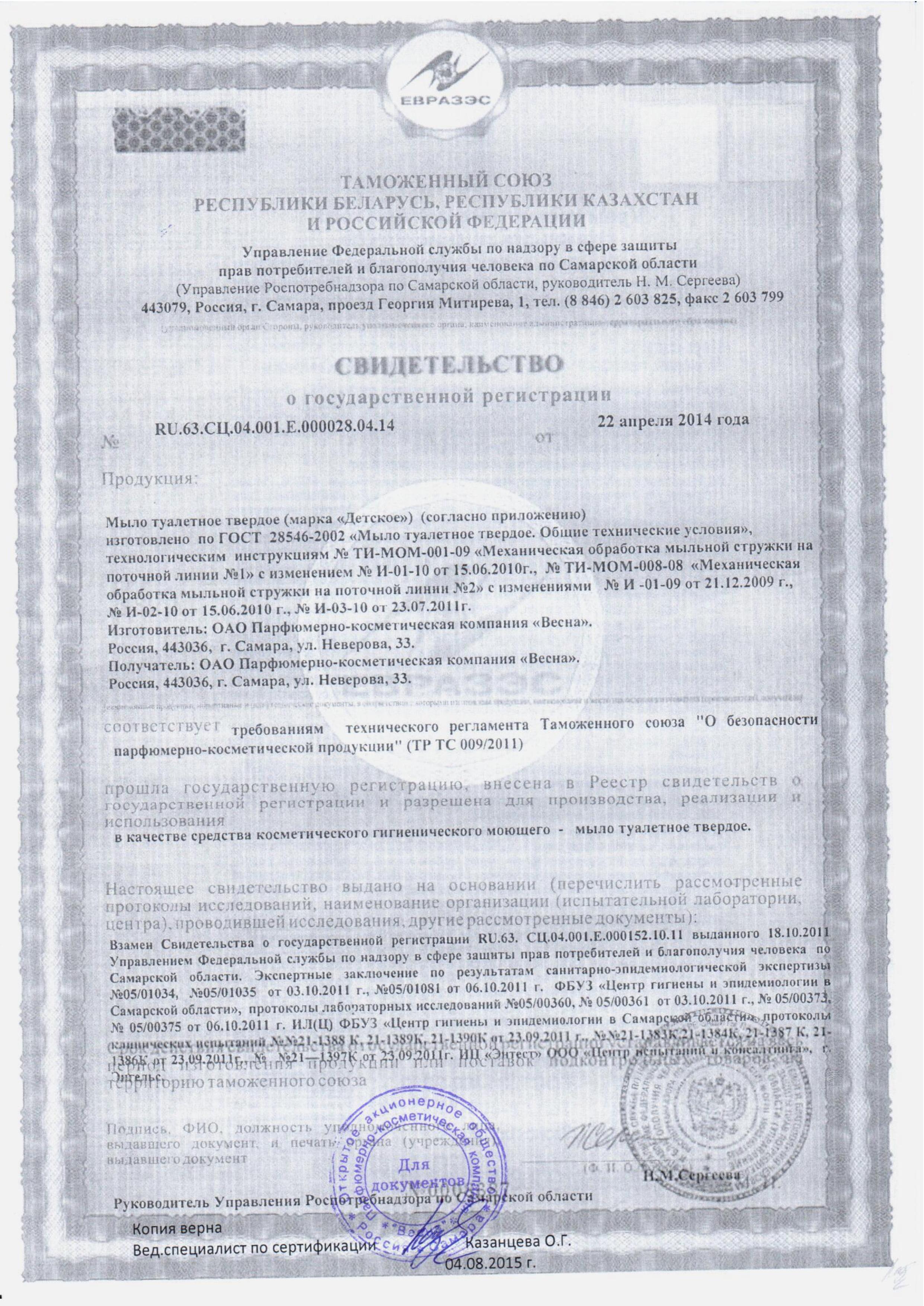 Сертификат на товар - Мыло туалетное Весна Детское нейтральное 90 г