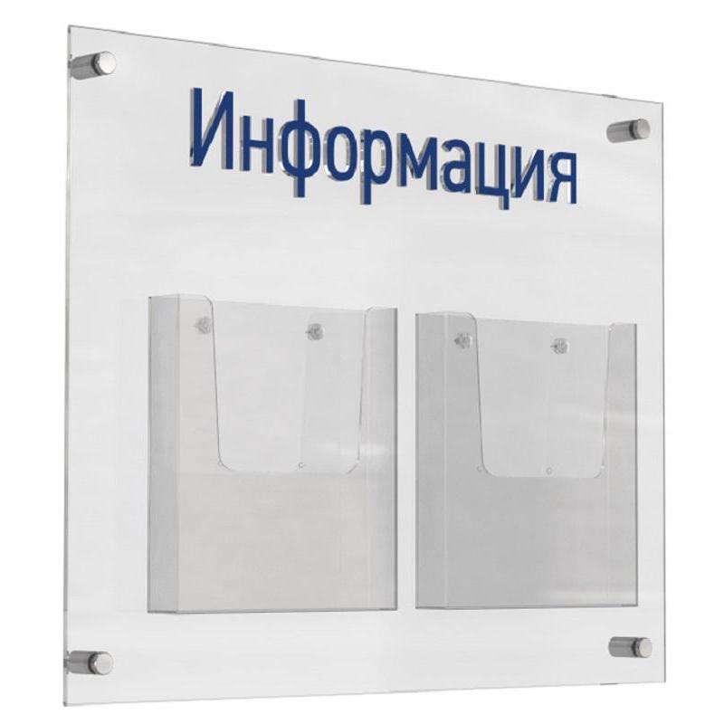 Информационный настенный стенд с объемными карманами предназначен для размещения материалов формата А4, а также брошюры формата А4 в вертикальном положении. Изготовлен из акрила прозрачного цвета, толщиной 5 мм, 2 объемных кармана - литьевой полистирол. Оформление надписи из объемного акрила толщиной 3 мм. Установка стенда осуществляется на дистанционных держателях, благодаря чему между стеной и стендом появляется расстояние в 15-20 мм. Так достигается красивый визуальный эффект. Благодаря своим прекрасным эстетическим качествам, держатели отлично смотрятся на стене, а простая конструкция позволяет быстро монтировать их. Функционал и эстетичный вид данного изделия позволяют разместить его в любом интерьере, будь то магазин, офис, выставка, медицинское учереждения, салон красоты, торговый центр, школа, институти т. д.