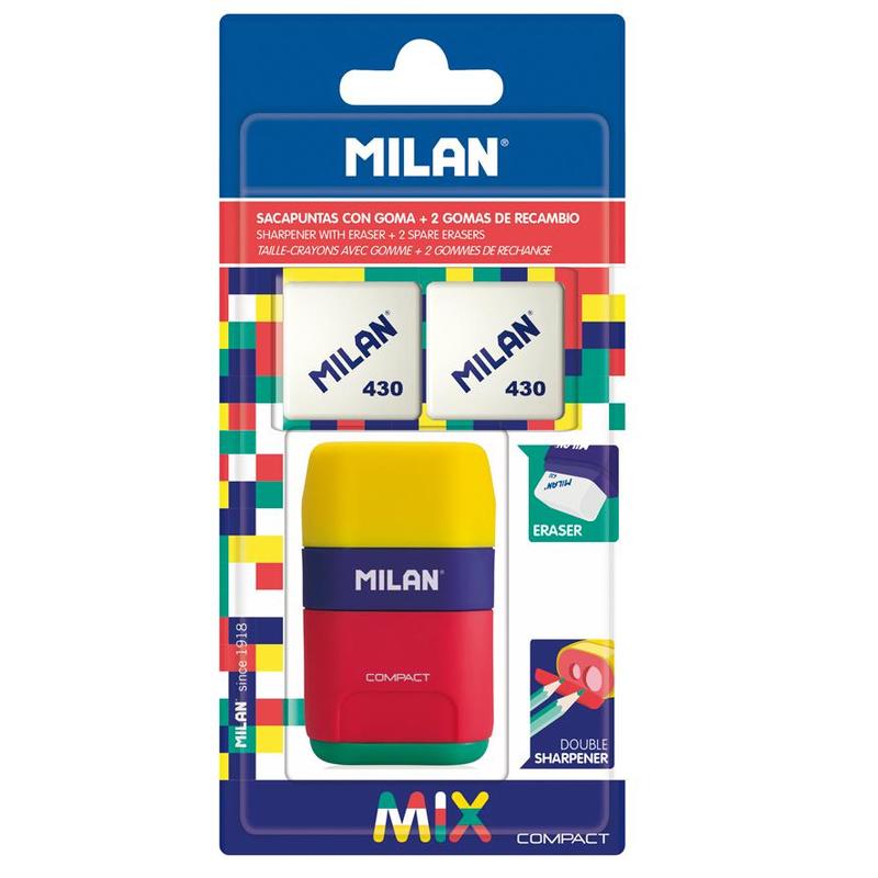 Набор ластик-точилка для карандашей с двумя отверстиями, коллекция Compact Mix и 2 мягких каучуковых ластика. Мягкий квадратный ластик из синтетического каучука 430 может использоваться для стирания чернографитного карандаша со всех типов бумаги. Точилка для стандартных и утолщенных карандашей c прочным лезвием из углеродистой стали, со встроенной системой безопасных лезвий. Набор поставляется в блистере с европодвесом. Цвет разноцветный в ассортименте.