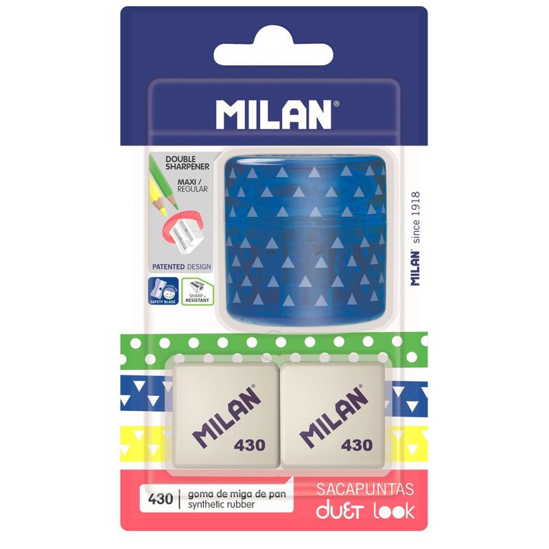 Набор синяя прозрачная двойная точилка для карандашей (одна стандартная точилка и одна точилка Maxi) с контейнером и 2 мягких ластика из каучука. Точилка для карандашей имеет острое и прочное лезвие из углеродистой стали, что делает его идеальным для всех видов карандашей. Он также имеет систему безопасных лезвий, которая предотвращает отсоединение лезвия от корпуса точилки для карандашей. Разработано в Испании собственным отделом исследований и разработок Milan. Поставляется в блистере с европодвесом.