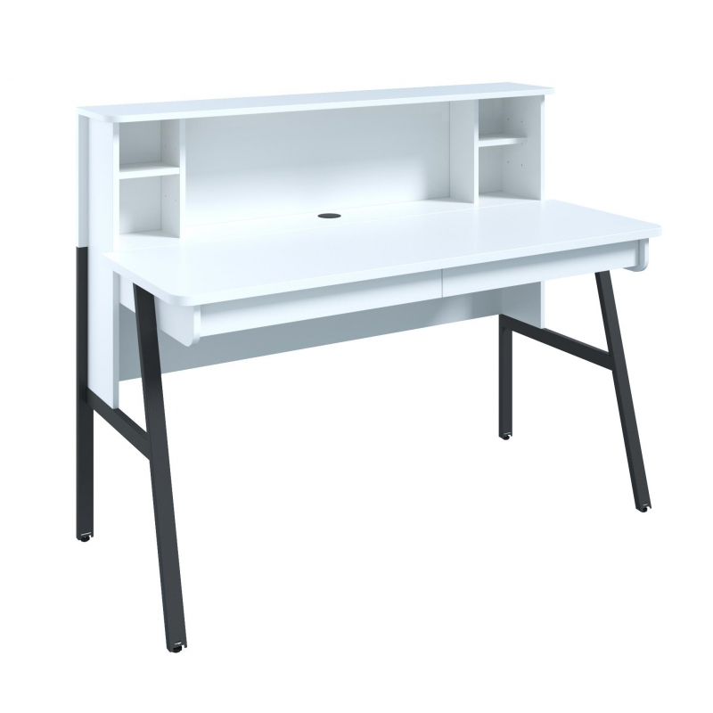 Стол на металлическом полукаркасе с удлиненной задней стенкой, соединенной с двумя узкими боковыми стенками ДСП 16 мм, образующими узел, который над уровнем крышки стола образует надставку, завершенную верхней крышкой, в которую вмонтированы две полочки, а ниже уровня крышки стола этот узел соединяется с металлическим полукаркасом. Крышка и задняя стенка ДСП 22 мм, все остальные детали изготовлены из ДСП 16 мм. Кромки 2 мм и 1 мм. Два выдвижных ящика на роликовых направляющих без лицевой фурнитуры, открывание ящиков снизу за выступающий фасад. Крышка стола укомплектована проводником. Металлический полукаркас имеет регулировку по высоте, ножки укомплектованы прокладками самоклеящими войлочными. Изображения товаров на сайте не могут гарантировать точную цветопередачу.