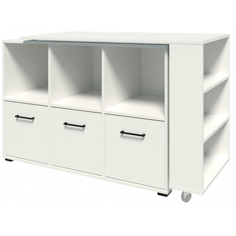 Стол со сдвижной крышкой представляет собой тумбу-основание и мобильную крышку, которая одной стороной крепится к крышке тумбы-основания посредством опорного поворотного механизма и может двигаться на 360 градусов вокруг его оси. Мобильная крышка другой стороной опирается на открытый торцевой стеллаж с полками, установленный, в свою очередь, на два ролика, один из которых имеет стопор. Стопор позволяет зафиксировать мобильную крышку импровизированного стола в нужном положении. Во избежание изгибов мобильная крышка с обратной стороны укреплена двумя стальными траверсами сечением 20x9 мм. Тумба опорная установлена на шести регулируемых ножках с самоклеящимися войлочными прокладками, тумба имеет три выдвижных ящика на роликовых направляющих L300 - каждый ящик с металлической ручкой L128 черного цвета, в тумбе имеются три открытые ниши - по одной над каждый ящиком. При необходимости крышку стола с открытым стеллажем на роликах можно легко убрать, задвинув ее на тумбу опорную.