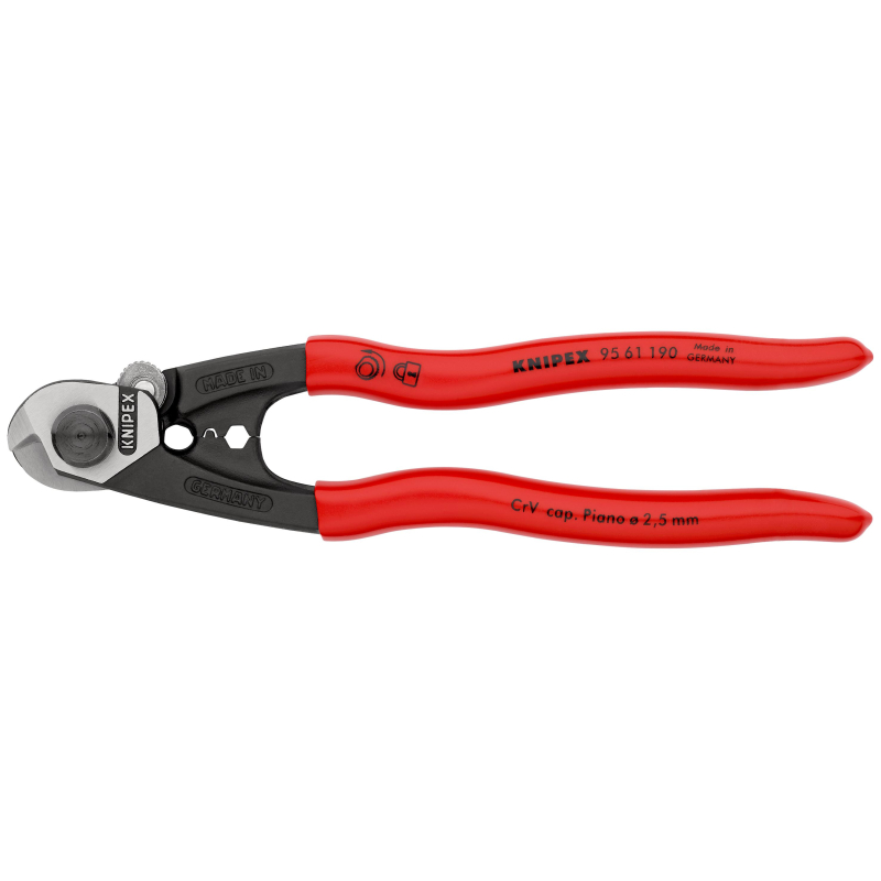 Тросорез KNIPEX 190 мм (KN-9561190) применяется для резания проволочных тросов различных типов, проволоки средней твердости, рояльных струн и многожильных кабелей из меди и алюминия. В конструкции инструмента предусмотрен специальный регулируемый винтовой шарнир с внутренней раскрывающейся пружиной для более точного управления ножами. Малый вес - 0.314 кг и удобная вытянутая конструкция снижают энергоемкость работы. Специальные пластмассовые накладки на ручках инструмента - для более комфортной работы и защиты рук оператора. В конструкции предусмотрен специальный регулируемый винтовой шарнир с внутренней раскрывающейся пружиной для более точного управления ножами. Для ограничения ширины раскрытия и блокировки для более удобной транспортировки тросорез оснащен специальным ограничителем. Инструмент оснащен двумя профилями для опрессовки наконечников трубок боуденовских тросов и концевых гильз проволочных тросов.ПреимуществаМалый вес - 0.314 кг и удобная вытянутая конструкция снижают энергоемкость работы;Длительный срок эксплуатации достигается закалкой кованой хромованадиевой стали, используемой при изготовлении инструмента;Полированная головка обеспечивает более высокую точность работы;Возможность работы с проволочными тросами диаметром до 6 мм, сортовой круглой сталью диаметром до 4 мм, проволокой средней твердости и многожильными кабелями из меди и алюминия за счет высокой твердости резца - 64 НRC;При разрезании трос не расплетается благодаря особой геометрии реза;Длина тросореза составляет всего 190 мм, что упрощает его хранение и транспортировку.Гарантия производителя 2 годаВнешний вид и/или характеристики товара могут быть изменены производителем в соответствии с производственным процессом.