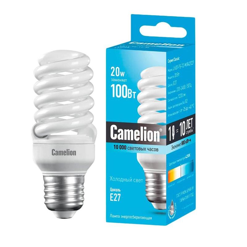 Энергосберегающая лампа 20Вт Camelion LH20-FS-T2-M/842/E27, имеет стандартный цоколь Е27 и подойдет ко всем осветительным приборам, где используются обычные лампы накаливания. Не оказывает негативного влияния на зрение,а высокий уровень цветопередачи помогает передать естественные оттенки предметов. Бесперебойно работает при широком диапазоне температур, что позволяет использовать ее вне помещений, на открытом воздухе.