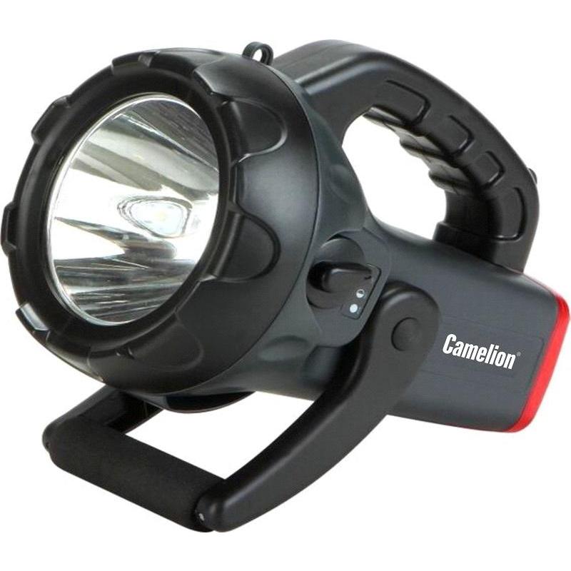 Фонарь Camelion электрический светодиодный аккумуляторный. Цвет корпуса - серый (carbon grey) с черным и красным. Материал корпуса - пластик. Источник света - светодиод XM-L T6 мощностью 10 ватт с цветовой температурой 6600К, со световым потоком 800 люмен. Дистанция освещения - до 230 метров. очень яркий, широкий и длинный луч. Дополнительное освещение: красные мигающие сигнальные светодиоды. Два режима работы. Выключатель - двухпозиционный тумблер. Время работы после полного заряда аккумулятора: светодиод XM-L T6 - до 3,5 часов, мигающие красные светодиоды - несколько суток. Время заряда 18 - 20 часов. Комплектация: фонарь, свинцово-кислотный аккумулятор с напряжением 4 В емкостью 4 А-ч, сетевой адаптер ~220 Вольт и автомобильный адаптер DC12 Вольт для заряда, поворотная подставка, упаковка, инструкция. Степень пыле-влаго-защиты IP44. Упаковка - коробка. Максимальный линейный размер фонаря 21 см.
