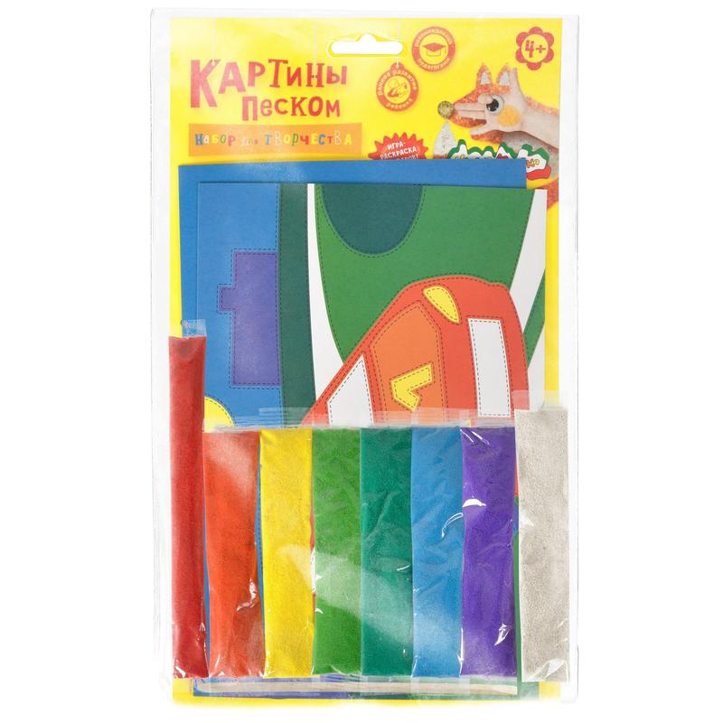 Раскрашивание песком - увлекательное занятие по созданию картин из природного материала! Этот вид творчества известен с древнейших времен под названием "создание фрески". Раскрашивать песком увлекательно и очень удобно. Песок высыпается на самоклеящуюся цветную основу с контурами рисунка. Натуральный мягкий песок ярких цветов - лучший материал для создания песочных фресок. Набор предназначен для детей от 4х лет. Состав набора: 2 цветные картины-основы формата А5 на плотном картоне, 8 ярких цветов песка в удобных удлиненных трубочках, деревянная палочка для удобства отклеивания элементов. Набор упакован в пакет с европодвесом. Размер 280х165х12мм.