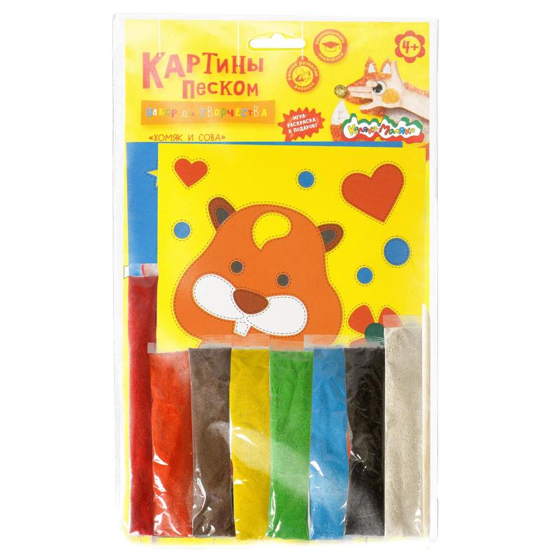 Раскрашивание песком - увлекательное занятие по созданию картин из природного материала! Этот вид творчества известен с древнейших времен под названием "создание фрески". Раскрашивать песком увлекательно и очень удобно. Песок высыпается на самоклеящуюся цветную основу с контурами рисунка. Натуральный мягкий песок ярких цветов - лучший материал для создания песочных фресок. Набор предназначен для детей от 4х лет. Состав набора: 2 цветные картины-основы формата А5 на плотном картоне, 8 ярких цветов песка в удобных удлиненных трубочках, деревянная палочка для удобства отклеивания элементов. Набор упакован в пакет с европодвесом. Размер 280х165х12мм.