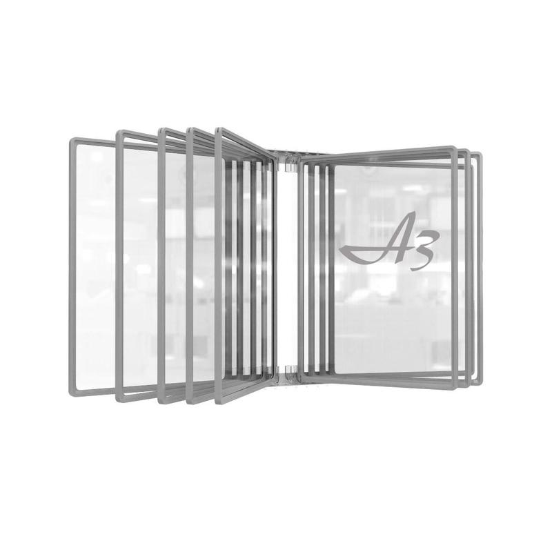 Настенная демосистема состоит из металлического модуля, в основании которого крепятся 10 пластиковых панелей формата А3. Панели, поставляемые в комплекте, имеют окантовку серого, белого или синего цвета (в зависимости от партии товара, без возможности выбора), антибликовую поверхность. Используются для показа информационных материалов в офисе, на выставках, магазинах, в банках, в учебных учреждениях, торговых центрах, магазинах и т.д.