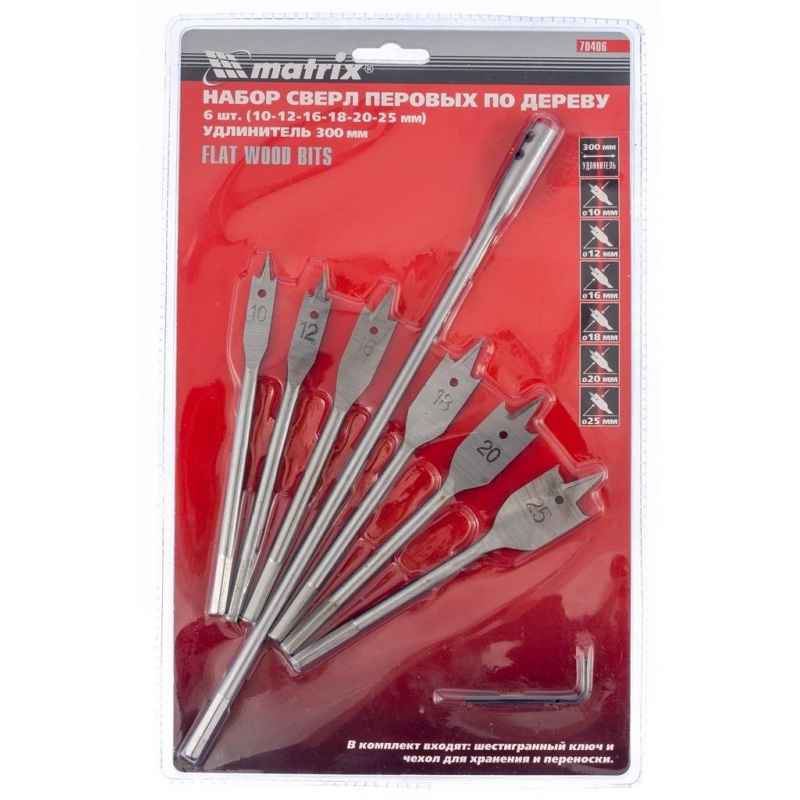 Перовые сверла изготовлены из углеродистой стали. Твердость режущих кромок 45-54 HRC. Предназначены для сверления отверстий в древесине. Набор 70406 дополнительно комплектуется удлинителем 300 мм. Хвостовики имеют шестигранную форму, что предотвращает поворот сверла. Центрирующее острие исключает необходимость в предварительном засверливании.