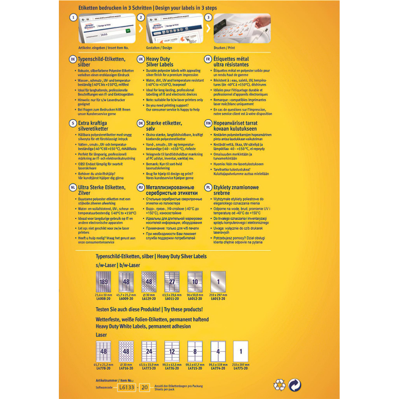 Этикетки Avery Zweckform из прочного полиэстера серебристого цвета - оптимальное решение для архивов и дорогостоящих товаров, электронного оборудования, маркировки инвентаря, электронных компонентов, указания паспортных данных, инвентарной описи. Отлично приклеиваются как на гладкие, так и на неровные поверхности. Особо прочные, устойчивые к воздействию загрязняющих веществ, влаги, перепадов температуры (от -40 до +150 °C). Стойкие по отношению к маслам и ультрафиолету, моющиеся, грязеотталкивающие. Гарантия беспрепятственного прохождения листов через любой монохромный лазерный принтер, что подтверждено немецкой сертификацией TUV SUD (Объединение технического надзора). Гарантированное запекание тонера и четкий отпечаток.