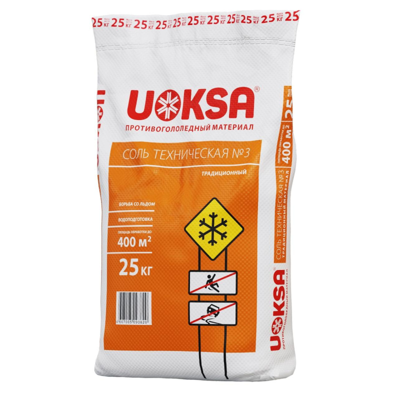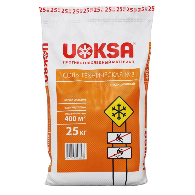 Реагент противогололедный Uoksa соль техническая до -15°С мешок 25 кг. Оптимален в условиях умеренно низких температур. Изготовлен на основе природной соли. Для уборки снежного наката и льда, профилактики образования гололеда. Для использования на дорогах, тротуарах, дворовых территориях, домовладениях. Хранить в сухом помещении. Срок хранения до 5 лет. Эффективен до -15°C. Средний расход 70-90 г/кв.м.