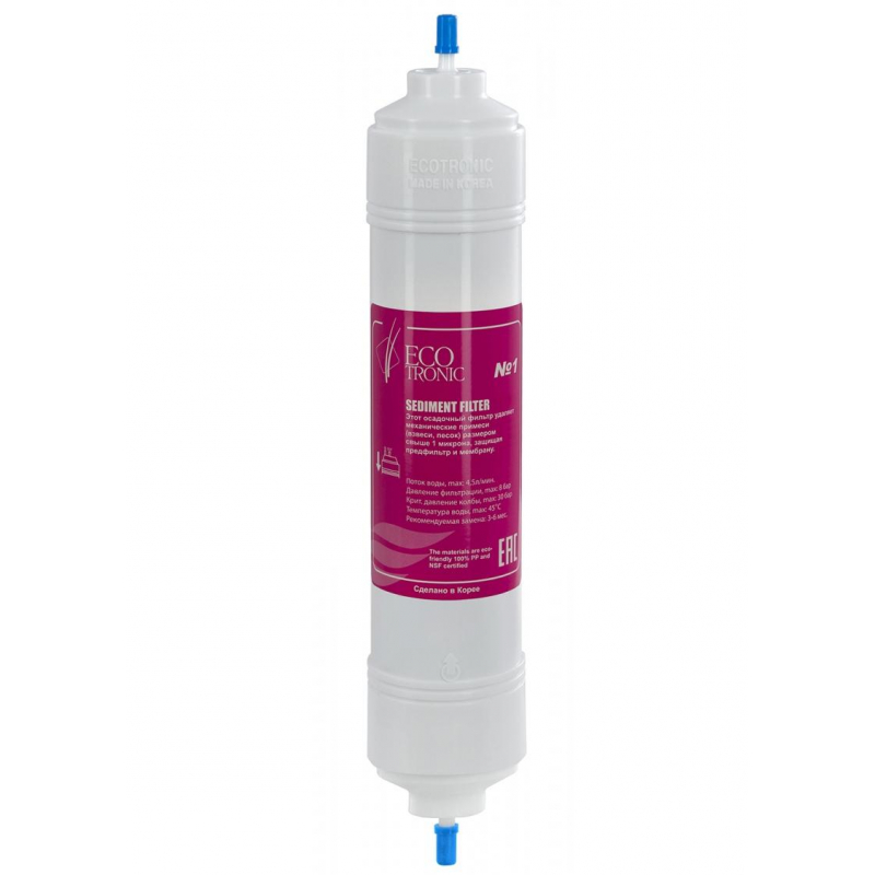Фильтр механический для пурифайера 14' I-тип №1 Sediment от компании Ecotronic является частью группы седиментарных (осадочных) картриджей и осуществляет механическую очистку воды от крупных частиц, таких как: Песок; Ржавчина; Стекло; Ил. Учитывая, что данные частицы в системах центрального водоснабжения встречаются практически повсеместно, данный картридж для фильтра является незаменимым и зачастую используется в качестве первой ступени очистки воды. Степень фильтрации - 5 микрон. Он способен практически полностью предотвратить образование осадка, устранить сторонний запах и значительно улучшить вкусовые качества воды. Следует также отметить, что картридж оснащен выходами 'цанга-цанга' I-типа, что следует учесть при его монтаже. Может использоваться в любых моделях пурифайеров Ecotronic.