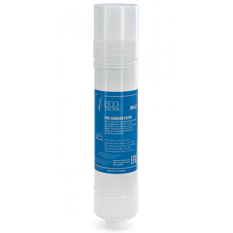 Фильтр Ecotronic №2 Pre-carbon 12' U-type - картридж второй ступени очистки для пурифайеров. Линейный картридж размера 12". Для очистки от хлора и органики. Ресурс зависит от степени загрязнения воды. Средний срок службы - около 6 месяцев.