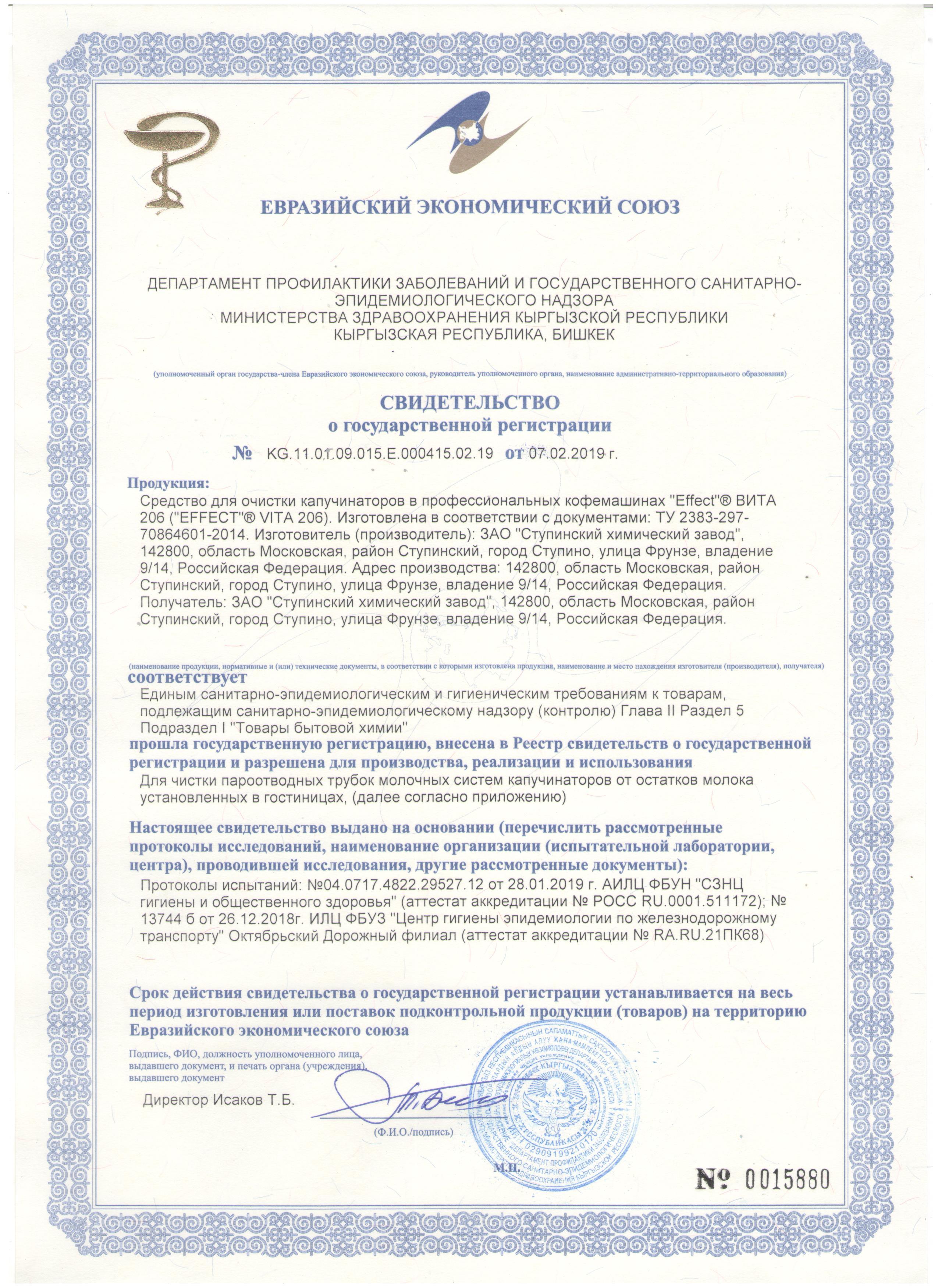 Сертификат на товар - Средство для очистки капучинаторов в профессиональных кофемашинах Effect Vita 206 1 л