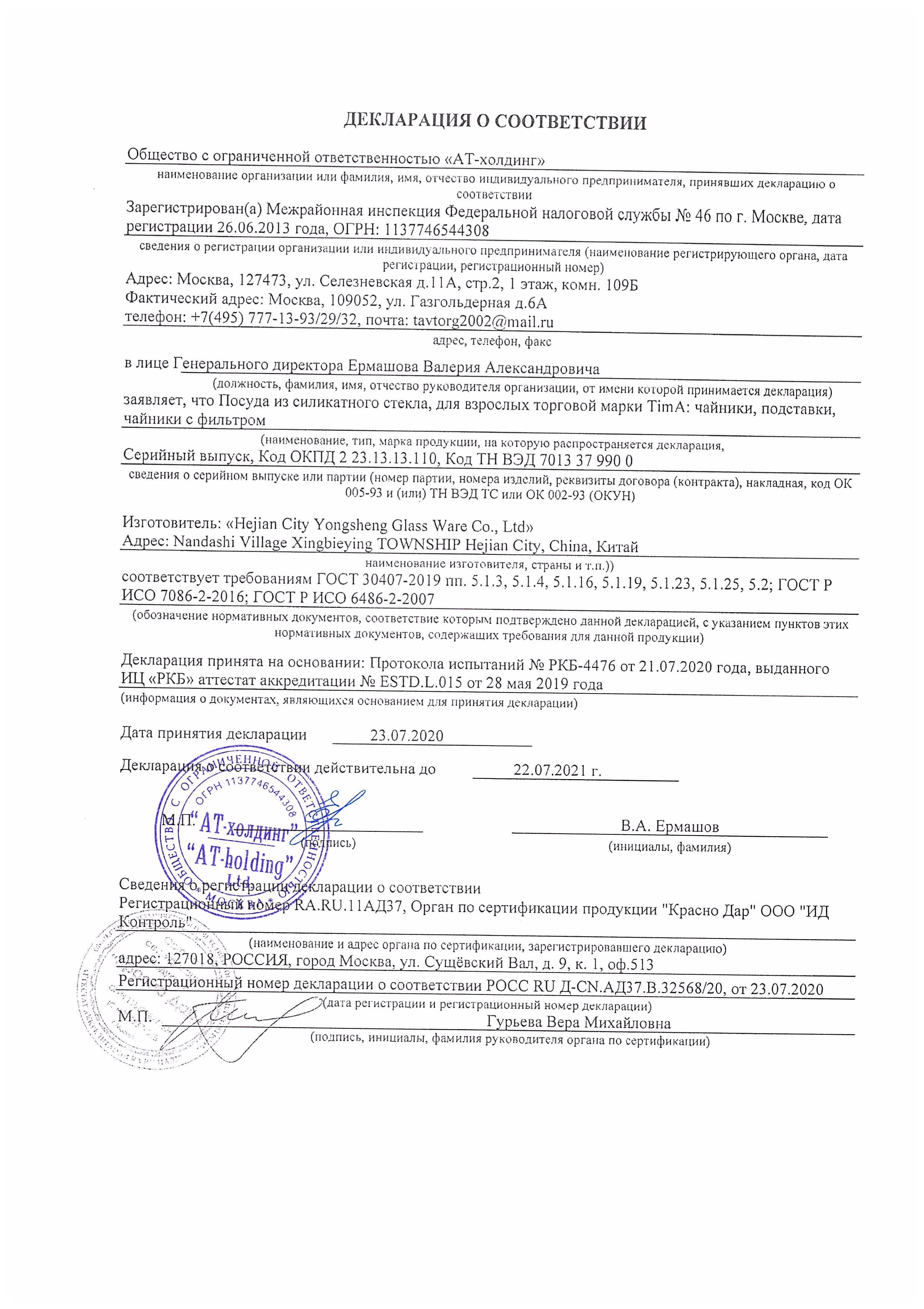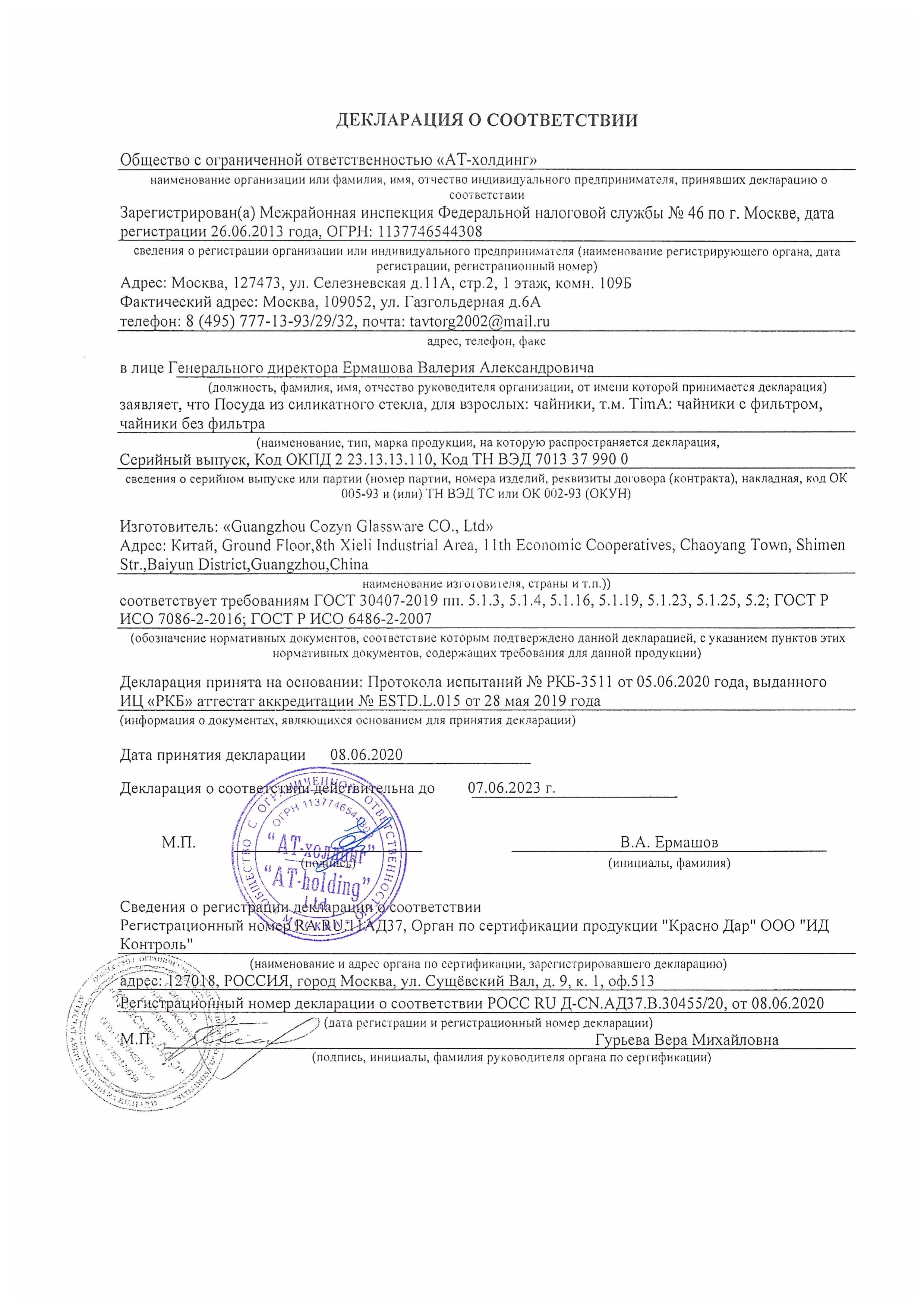 Сертификат на товар - Чайник заварочный Tima Иван-чай 600 мл