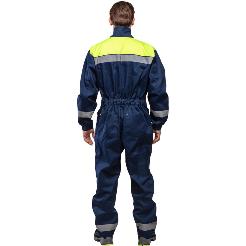 Комбинезон летний л30-КБЗ изготовлен из смесовой ткани (состав: 20% хлопок, 80% полиэстер), плотностью 210 г/кв.м. Комбинезон состоит из верхней и нижней частей. Наличие многофункциональных карманов. Центральная застежка - молния, с ветрозащитным клапаном. Светоотражающая полоса проходит на руках, ногах и спине.Цвет: синий/лимонный.Размер: 52-54.Рост: 182-188.Коллекция летней рабочей одежды л30 представлена полными комбинезонами л30-КБЗ и жилетами л30-ЖЛ выполненными в едином стиле в двух вариантах расцветки - синий с неоновой лимонной отделкой и серый с яркой оранжевой отделкой.