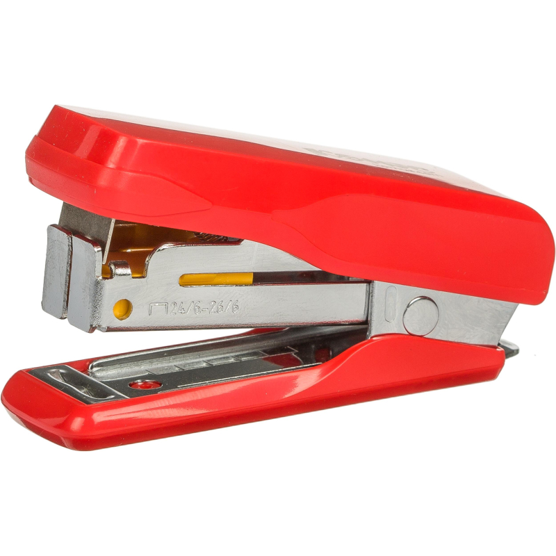 Степлер Комус выполнен в металлическом корпусе красного цвета. Рабочие компоненты изготовлены из высококачественной стали. Степлер совместим со скобами №24/6-26/6, одновременно сшивая до 20 листов бумаги плотностью до 80 г/кв.м. Модель оснащена антистеплером, механизмом быстрой загрузки скоб и индикатором наполненности лотка для скоб, что делает ее очень удобной в применении. Степлер сшивает как закрытым, так и прямым типом сшивания. Закрытый тип сшивания, при котором ножки скобы загибаются внутрь, дает возможность надежно хранить сшитые документы на протяжении длительного времени. Прямой тип сшивания, при котором ножки скобы не загибаются, позволяет прикреплять объявления или документы к мягкой поверхности, например к пробковой доске. Для этого достаточно раскрыть степлер на 180 градусов и закрепить документ. Вместимость лотка для скоб: 50 скоб размером №24/6 или №26/6. Глубина закладки бумаги: 27 мм.