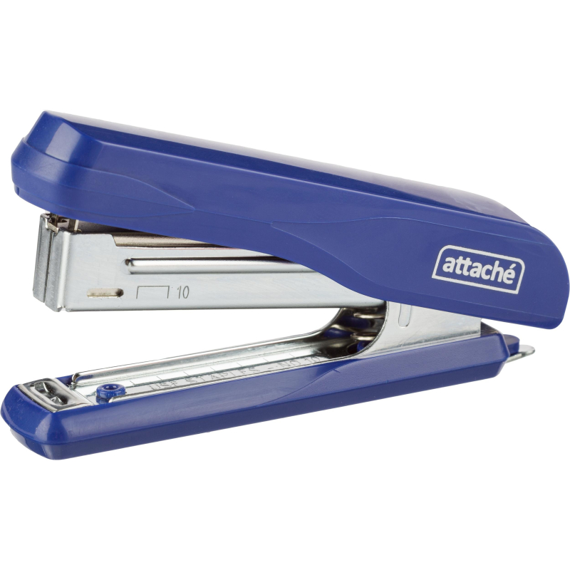 Степлер Attache выполнен в корпусе из высококачественного пластика синего цвета и оснащен металлической базой. Рабочие компоненты изготовлены из высококачественной стали. Степлер совместим со скобами №24/6-26/6, одновременно сшивая до 20 листов бумаги плотностью до 80 г/кв.м. Модель оснащена антистеплером, механизмом быстрой загрузки скоб и индикатором наполненности лотка для скоб, что делает ее очень удобной в применении. Степлер сшивает как закрытым, так и прямым типом сшивания. Закрытый тип сшивания, при котором ножки скобы загибаются внутрь, дает возможность надежно хранить сшитые документы на протяжении длительного времени. Прямой тип сшивания, при котором ножки скобы не загибаются, позволяет прикреплять объявления или документы к мягкой поверхности, например к пробковой доске. Для этого достаточно раскрыть степлер на 180 градусов и закрепить документ. Вместимость лотка для скоб: 50 скоб размером №10. Глубина закладки бумаги: 50 мм.