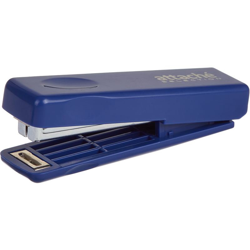 Степлер Attache Selection выполнен в пластиковом корпусе синего цвета. Рабочие компоненты изготовлены из высококачественной стали. Степлер совместим со скобами №10, одновременно сшивая до 10 листов бумаги плотностью до 80 г/кв.м. Модель компактна и принадлежит к типу складных степлеров, что дает возможность хранить ее как в сумочке, так и в кармане пиджака. Степлер сшивает как закрытым, так и прямым типом сшивания. Закрытый тип сшивания, при котором ножки скобы загибаются внутрь, дает возможность надежно хранить сшитые документы на протяжении длительного времени. Прямой тип сшивания, при котором ножки скобы не загибаются, позволяет прикреплять объявления или документы к мягкой поверхности, например к пробковой доске. Для этого достаточно раскрыть степлер на 180 градусов и закрепить документ. Вместимость лотка для скоб: 50 скоб размером №10. Глубина закладки бумаги: 41 мм.