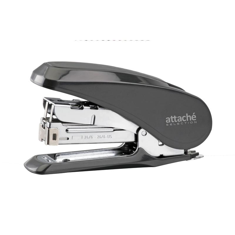 Степлер Attache Selection выполнен в металлическом корпусе серого цвета. Рабочие компоненты изготовлены из высококачественной стали. Детали корпуса выполнены из ударопрочного и износоустойчивого ABS-пластика. Степлер комфортно использовать за счет противоскользящей вставки на верхней части корпуса. Степлер совместим со скобами №24/6-26/6, одновременно сшивая до 30 листов бумаги плотностью до 80 г/кв.м. Благодаря технологии Less Effort при сшивании прилагается до 45% меньше усилий. Модель оснащена антистеплером, механизмом быстрой загрузки скоб и индикатором наполненности лотка для скоб. Степлер скрепляет бумагу закрытым типом сшивания, при котором ножки скобы загибаются внутрь. Это дает возможность надежно хранить сшитые документы на протяжении длительного времени. Вместимость лотка для скоб: 50 скоб размером №24/6 или 10 скоб размером 26/6. Глубина закладки бумаги: 52 мм.