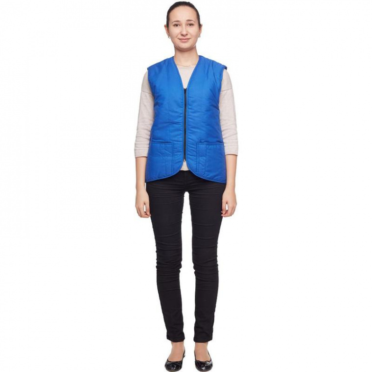 Жилет утепленный «Комфорт» (размер 48-50, рост 170-176) васильковый с центральной застёжкой на молнию и с двумя накладными карманами. Нижние концы борта закруглённые. Подходит для работ в прохладных помещениях или на улице, с ограничением от +5 до +7 градусов Цельсия. Жилет универсален, он может быть использован в качестве униформы для женщин и для мужчин. Ткань: смесовая (65% полиэстер, 35% хлопок). Плотность ткани: 120 г/кв. м. Утеплителем является синтепон — 100 г/кв. м. Ткань подкладки: 100% полиэстер. Защищает от общих производственных загрязнений.