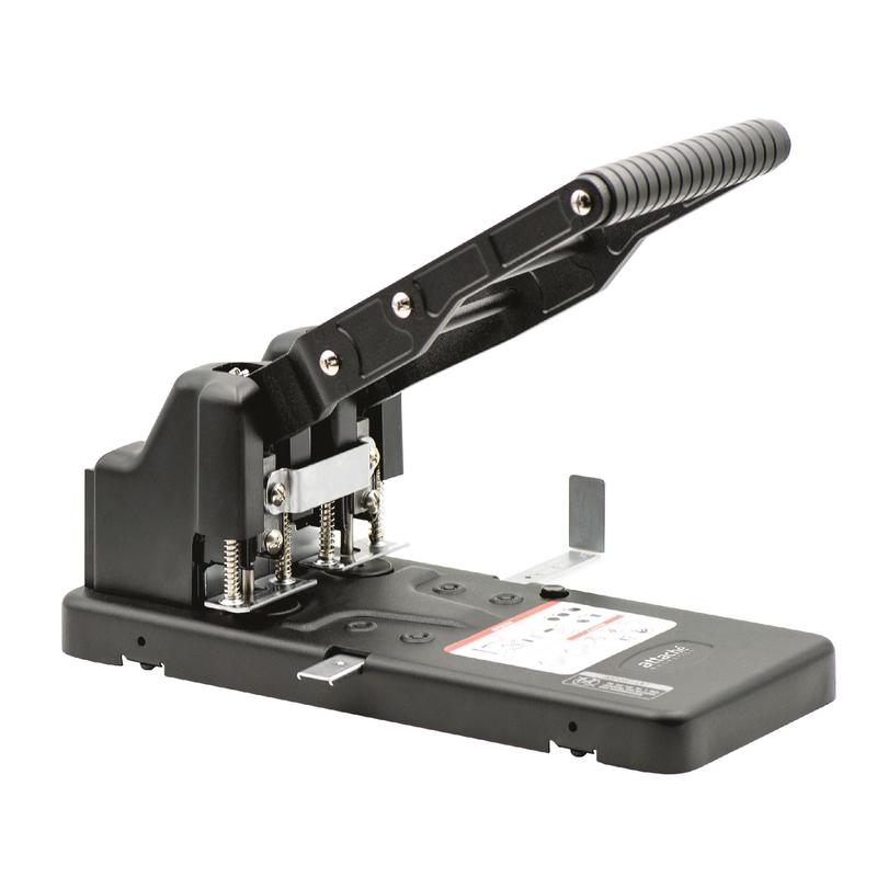 Дырокол мощный Attache Selection обладает цельнометаллическим прочным корпусом черного цвета. Для удобства эксплуатации снабжен высоким рычагом пружинного действия и оснащен стальным рабочим механизмом для одновременного пробивания 2-х отверстий диаметром 6 мм. Дырокол перфорирует до 150 листов бумаги плотностью до 80 г/кв.м. Расстояние между пробиваемыми отверстиями: 80 мм. Прорезиненная основа предотвращает скольжение во время работы и образование царапин на рабочей поверхности стола. Дырокол имеет линейку с делениями на форматы A3, А4, А5, B3, B4, B5, B6 для удобной фиксации бумаги на необходимом расстоянии. Отметка на линейке 888 позволяет использовать вместо дырокола на 4 отверстия. Контейнер для конфетти легко открывается и закрывается, исключая рассыпание бумажных остатков. Размеры изделия в открытом состоянии (ДxШxВ): 350x155x380 мм. Перед началом работы внимательно изучите инструкцию. Расходные материалы не представлены в ассортименте производителя и в ассортименте компании Комус.