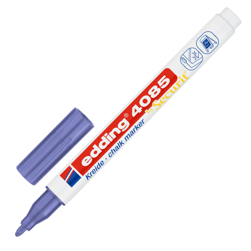 Меловой маркер edding 4085. Цвет фиолетовый металлик. Предназначен для нанесения рисунков и надписей на гладкие поверхности, такие как стекло, кафель, пластик, меловые доски (в том числе черные). Легко стираются влажной салфеткой. Чернила этого маркера - ни что иное как жидкий мел на водной основе без каких-либо примесей, поэтому данный маркер прекрасно подходит для детей. Edding 4085 - отличный инструмент для воплощения творческих идей дома, но так же рекомендуется для использования в офисах, ресторанах, стекольной и других видах промышленности. Уникальная особенность серии edding 4085 - наличие необычных цветов и тонкая линия письма - всего 1-2 мм, что является большой редкостью для меловых маркеров. Форма наконечника: круглая.