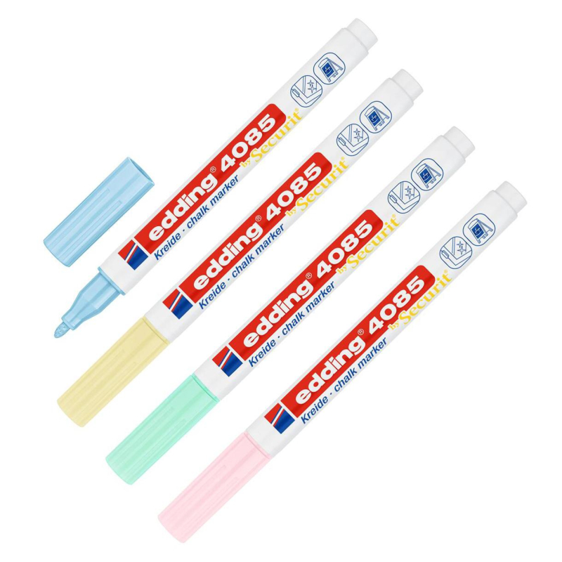 Набор меловых маркеров edding 4085. В наборе четыре маркера - пастельный желтый, пастельный розовый, пастельный голубой, пастельный зеленый. Упаковка - блистер. Эти маркеры предназначены для нанесения рисунков и надписей на гладкие поверхности, такие как стекло, кафель, пластик, меловые доски (в том числе черные). Легко стираются влажной салфеткой. Чернила этих маркеров - ни что иное как жидкий мел на водной основе без каких-либо примесей, поэтому данные маркеры прекрасно подходят для детей. Edding 4085 - отличный инструмент для воплощения творческих идей дома, но так же рекомендуется для использования в офисах, ресторанах, стекольной и других видах промышленности. Уникальная особенность серии edding 4085 - наличие необычных цветов и тонкая линия письма - всего 1-2 мм, что является большой редкостью для меловых маркеров. Форма наконечника: круглая.