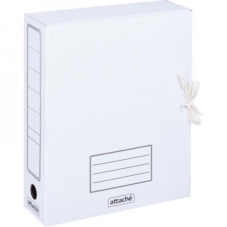 Архивная папка-короб Attache формата А4 выполнена из гофрокартона белого цвета. В закрытом состоянии фиксируется с помощью двух завязок. Ширина — 75 мм. Предусмотрены поля для надписей. Вместимость — до 750 листов стандартной плотности. Круглые отверстия на корешках предназначены для удобного захвата папки как в вертикальном, так и в горизонтальном положении. Поставляется в разобранном виде. Размер изделия — 252×75×322 мм.